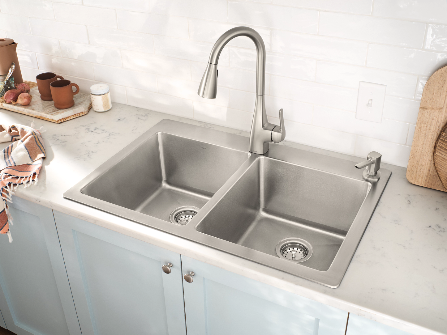 Melding striking style with helpful functionality, the Kiran™ faucet and sink combination is a beautiful, easy-to-install addition to the kitchen. It includes a transitional pulldown kitchen faucet with a unique square-shaped base and sculpted handle, 18-gauge rounded double bowl stainless steel sink, sink drains, and matching soap dispenser. The faucet features Moen’s Power Clean™ technology, which cleans 50 percent faster than Moen faucets without the technology, as well as the Reflex® system to ensure smooth operation and secure docking of the spray wand. The faucet’s Spot Resist™ Stainless finish provides a cleaner looking appearance, while SoundSHIELD™ technology on the sink reduces noise. This faucet and sink combination features a sleek design that will seamlessly accent an array of kitchen designs.