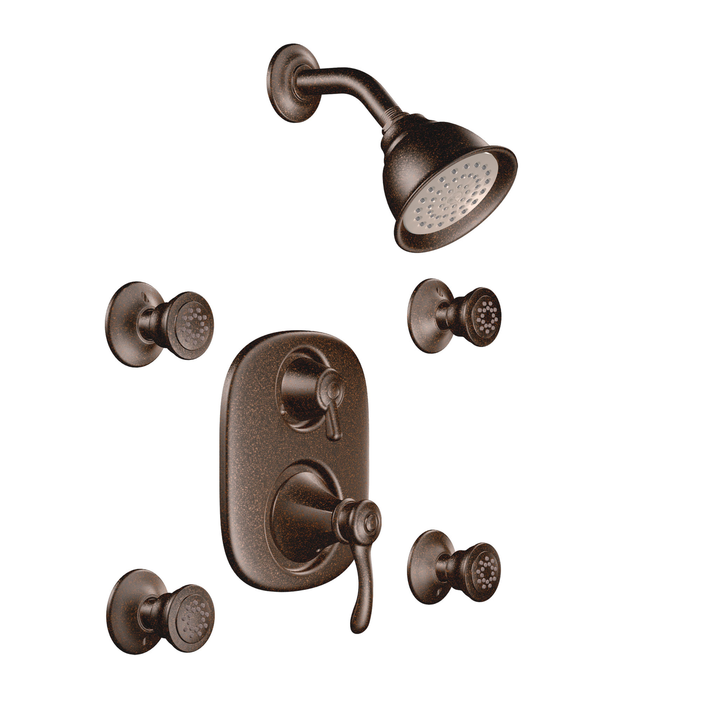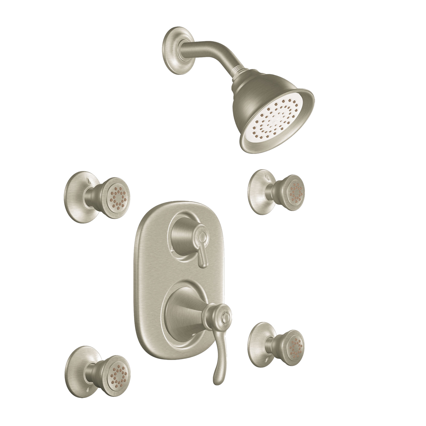 - equipped with the Moentrol® control valve allowing you to adjust both water volume and temperature. pressure-balancing feature helps maintain temperature even when other water sources in the house are in use