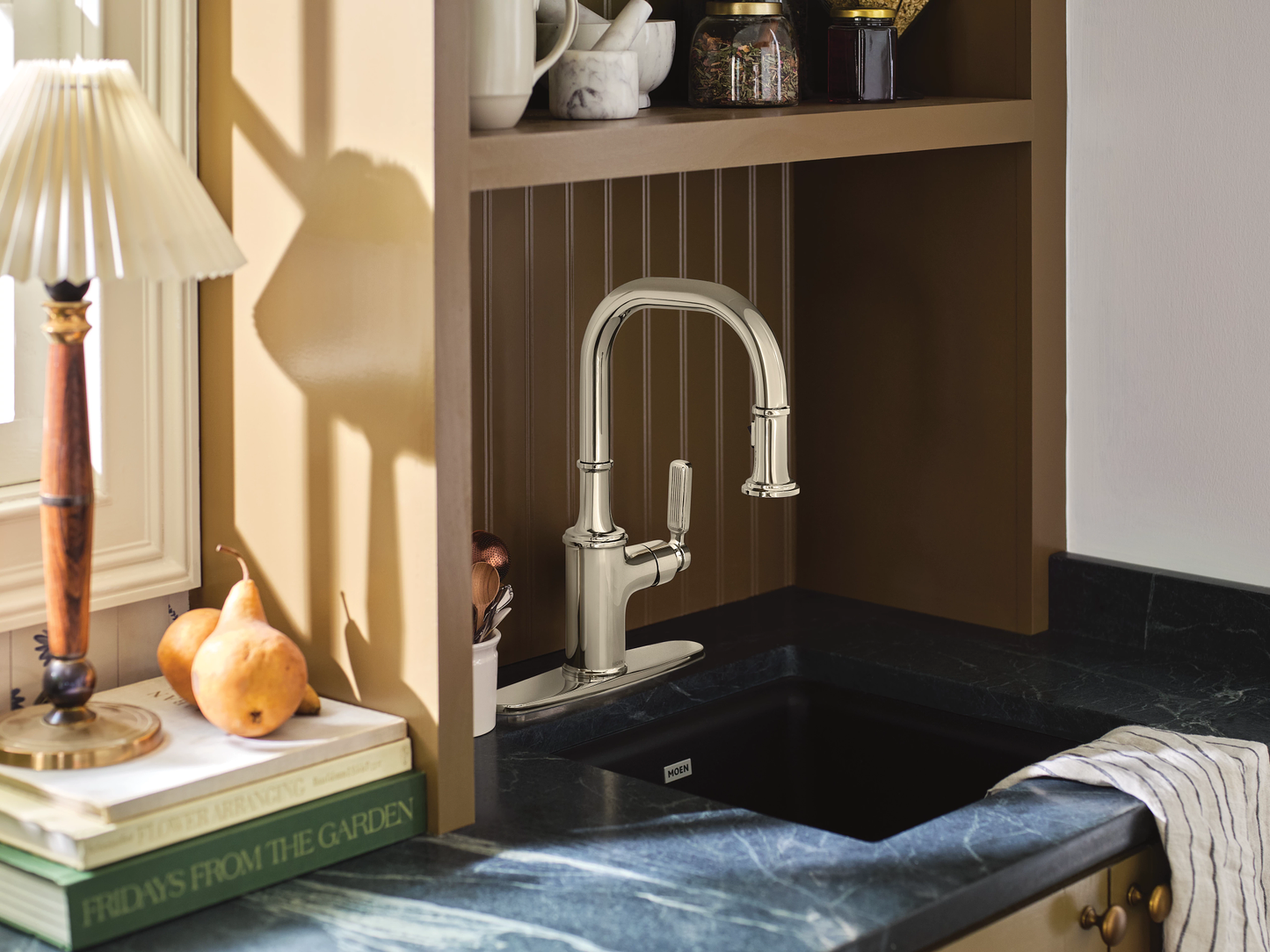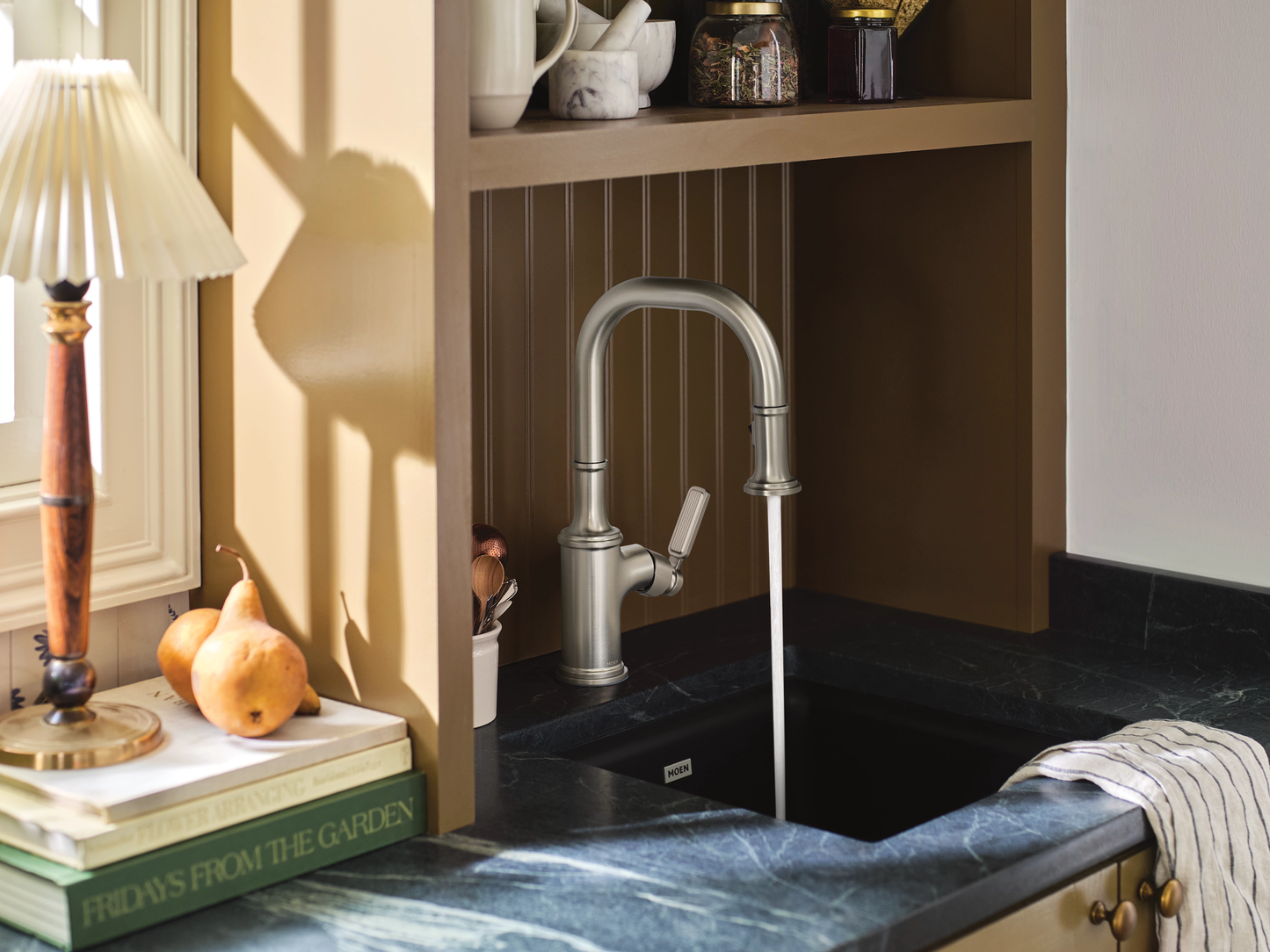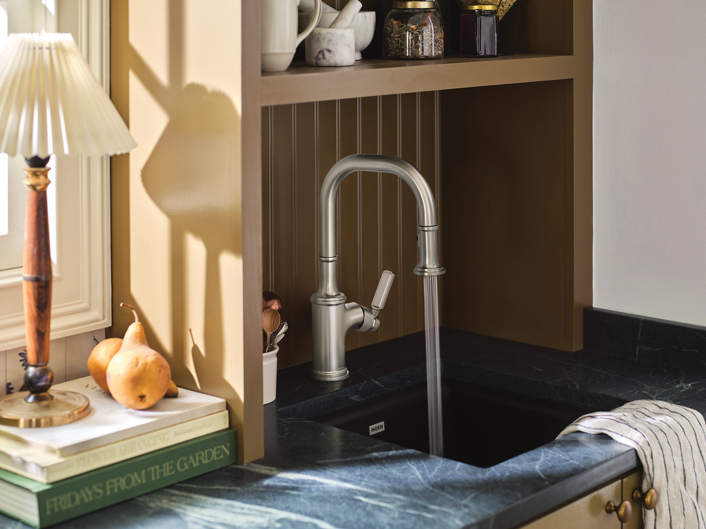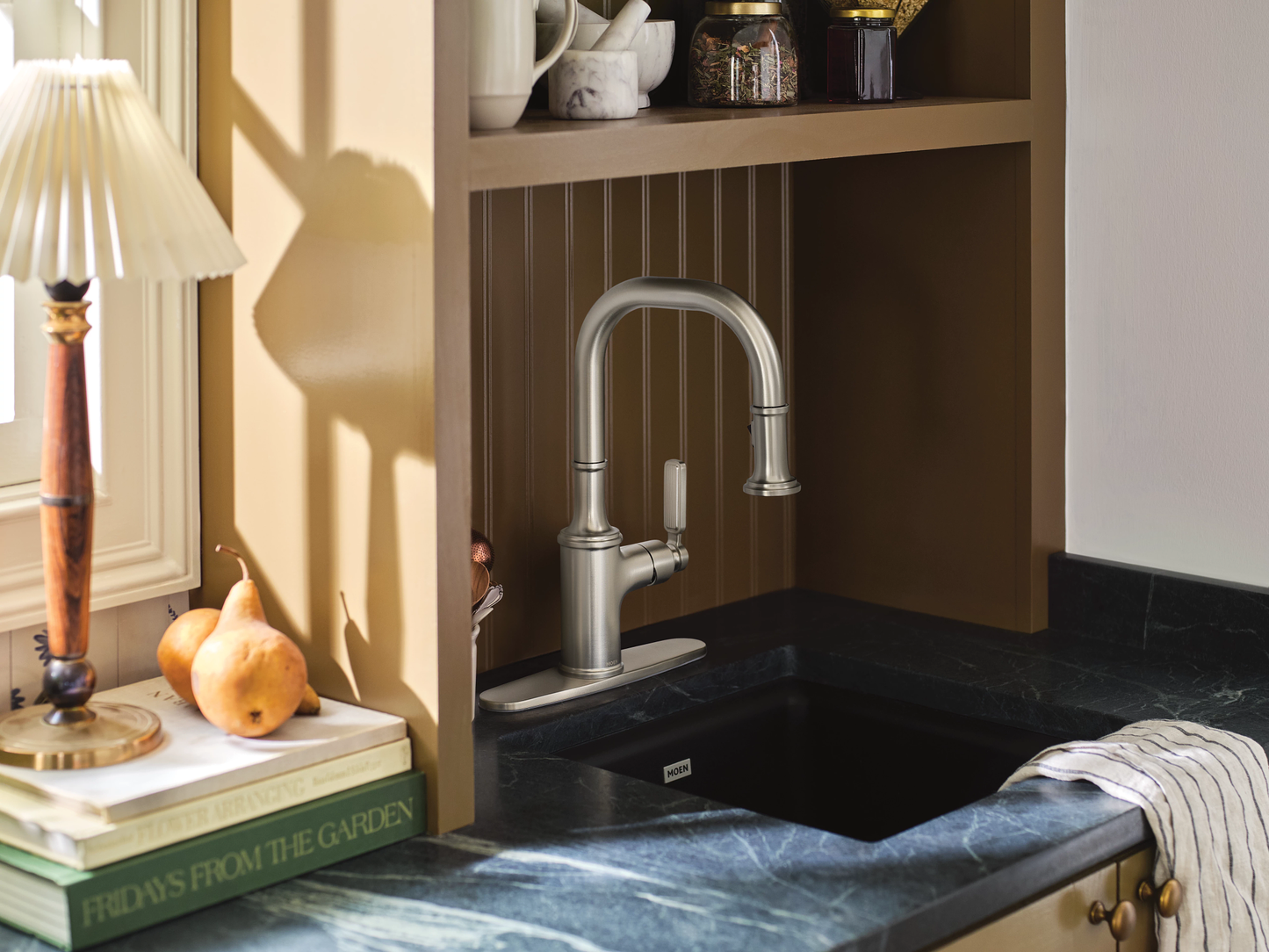 The Smyth pulldown kitchen faucet has a tailored, traditional design inspired by classic architectural details from the Cleveland Public Library. Each kitchen faucet includes a simple handle reminiscent of ornate furniture knobs, adding vintage flair to the kitchen. The faucet offers flexible water delivery, and the pulldown spray wand also provides the functionality to elevate experiences at the kitchen sink. It comes with Moen’s Power Boost technology for boosted spray power to fill containers and clean messes faster.