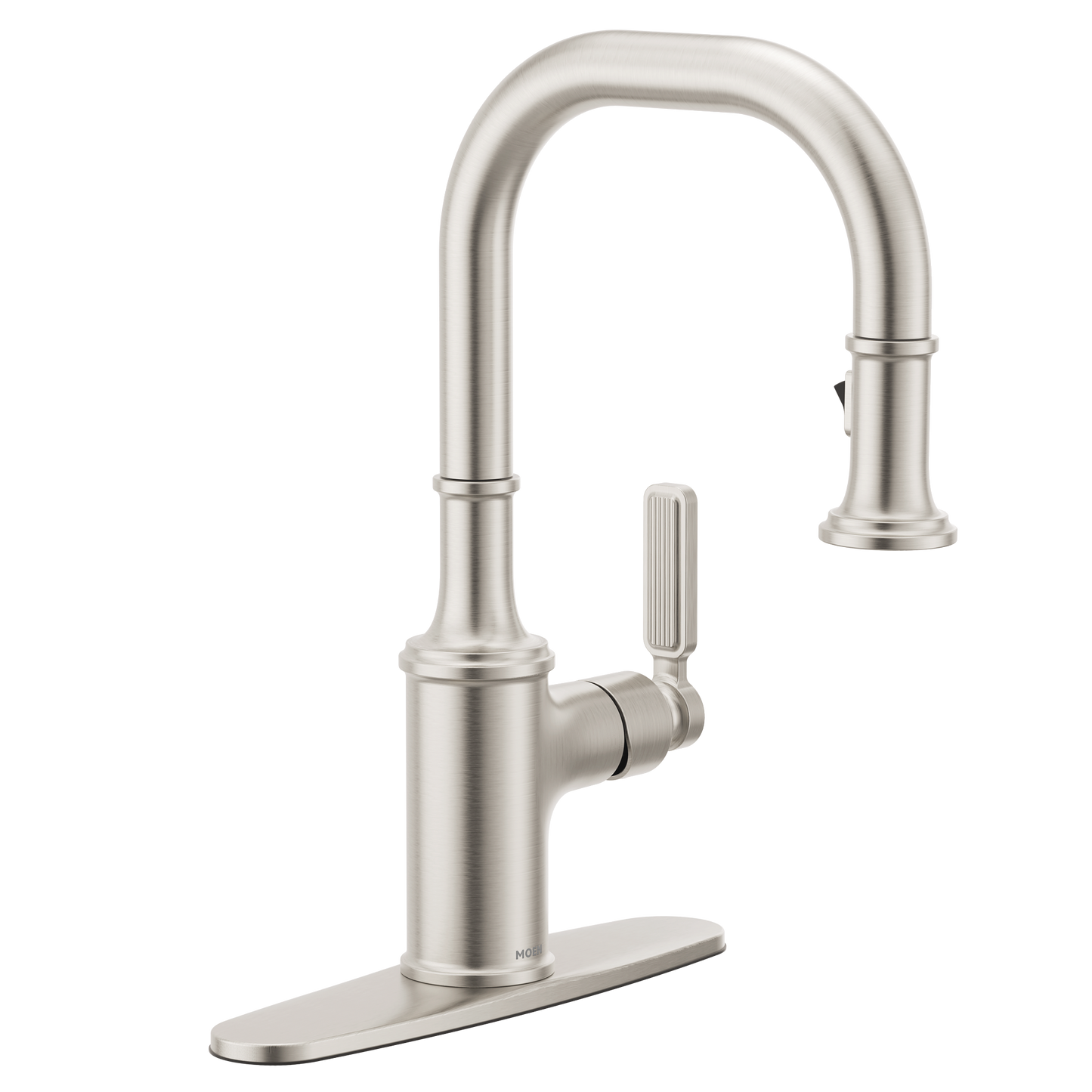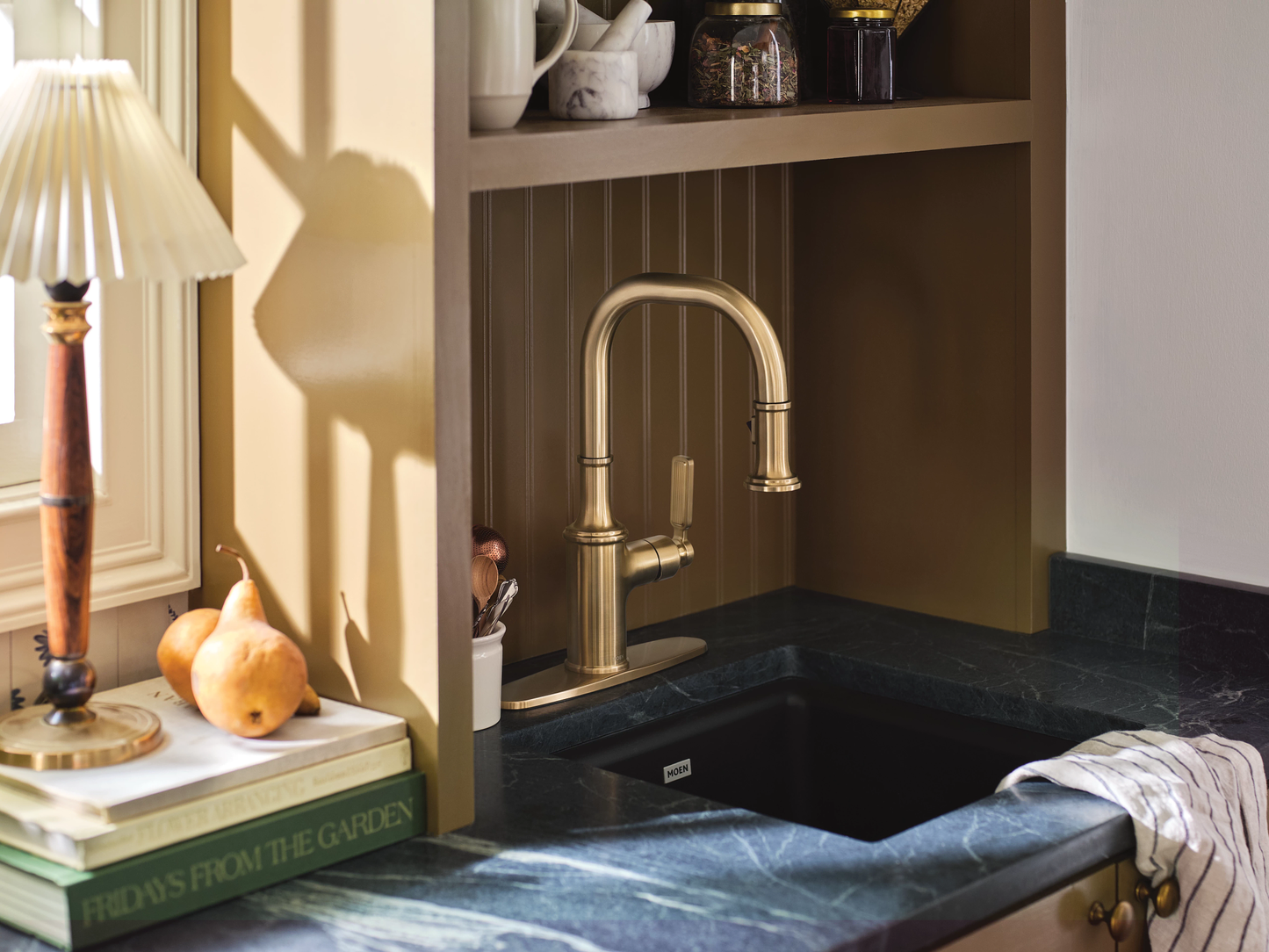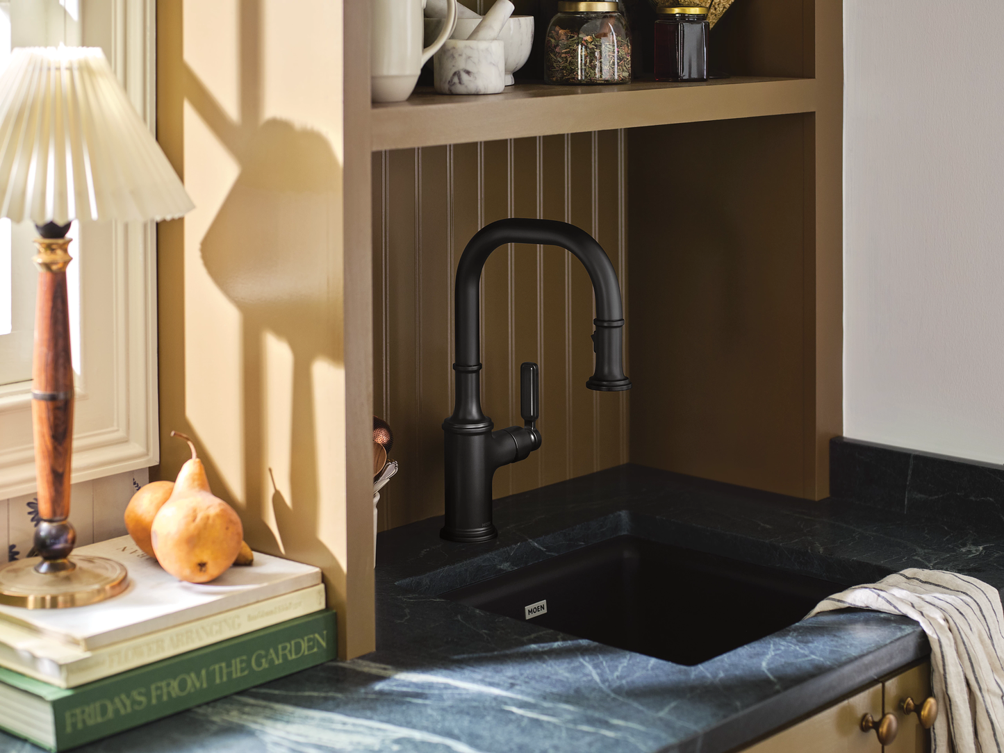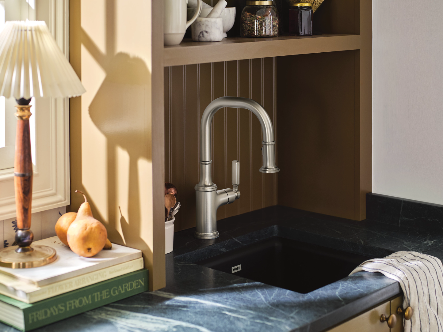 The Smyth pulldown kitchen faucet has a tailored, traditional design inspired by classic architectural details from the Cleveland Public Library. Each kitchen faucet includes a simple handle reminiscent of ornate furniture knobs, adding vintage flair to the kitchen. The faucet offers flexible water delivery, and the pulldown spray wand also provides the functionality to elevate experiences at the kitchen sink. It comes with Moen’s Power Boost technology for boosted spray power to fill containers and clean messes faster.