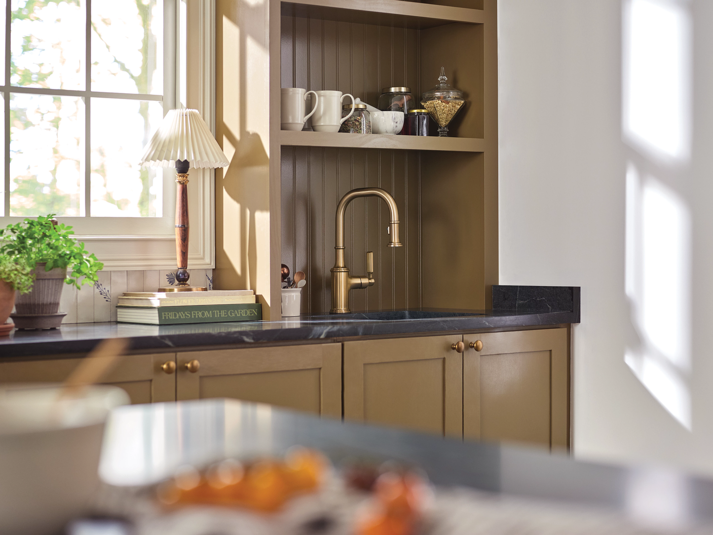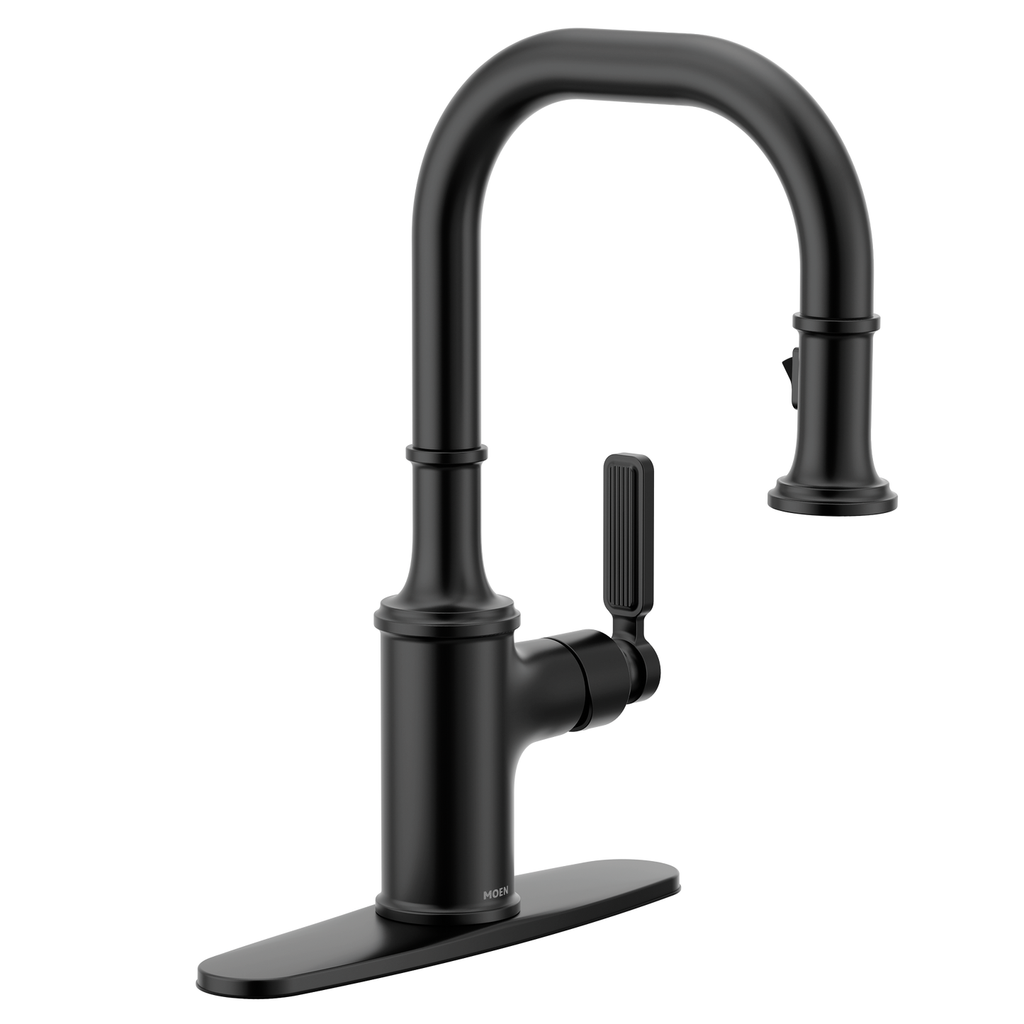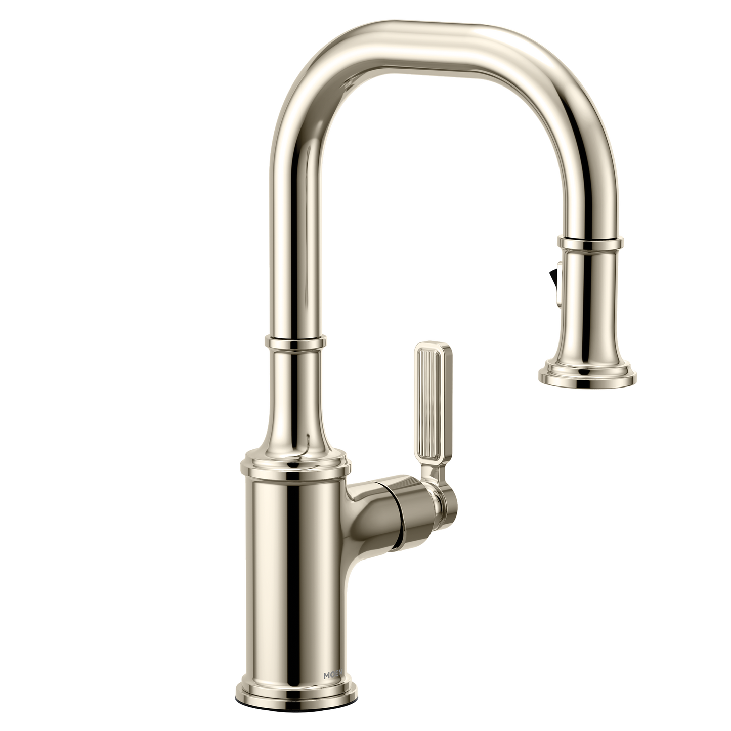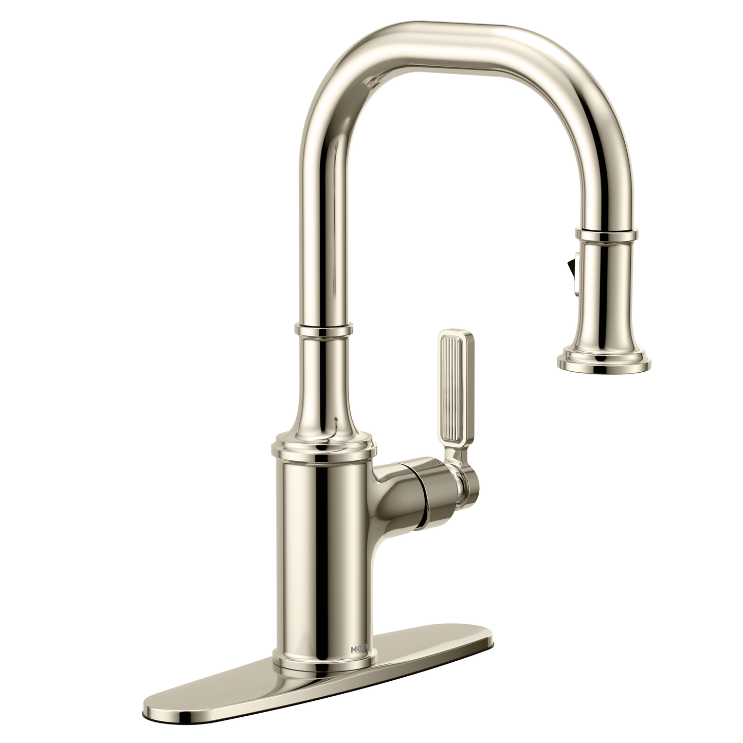 The Smyth pulldown kitchen faucet has a tailored, traditional design inspired by classic architectural details from the Cleveland Public Library. Each kitchen faucet includes a simple handle reminiscent of ornate furniture knobs, adding vintage flair to the kitchen. The faucet offers flexible water delivery, and the pulldown spray wand also provides the functionality to elevate experiences at the kitchen sink. It comes with Moen’s Power Boost technology for boosted spray power to fill containers and clean messes faster.