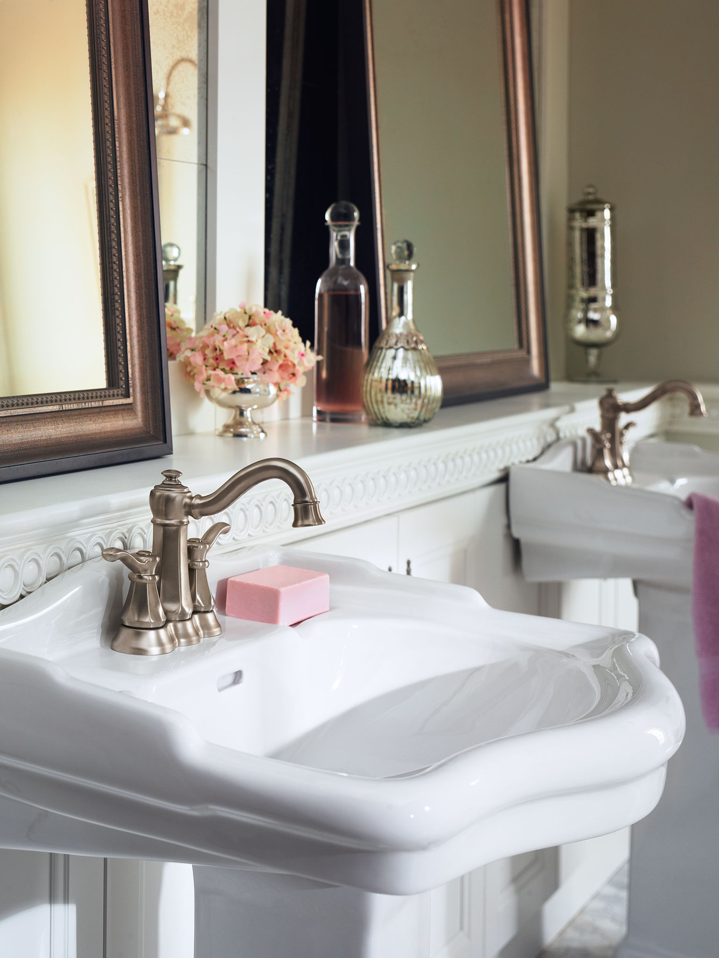 A faceted base and elegant spout are perfect examples of the stunning details that make Vestige faucets and accessories so special. This turn-of-the-century design is an ideal match for a highly Traditional bath featuring antique cabinetry.