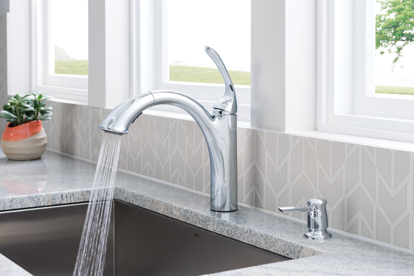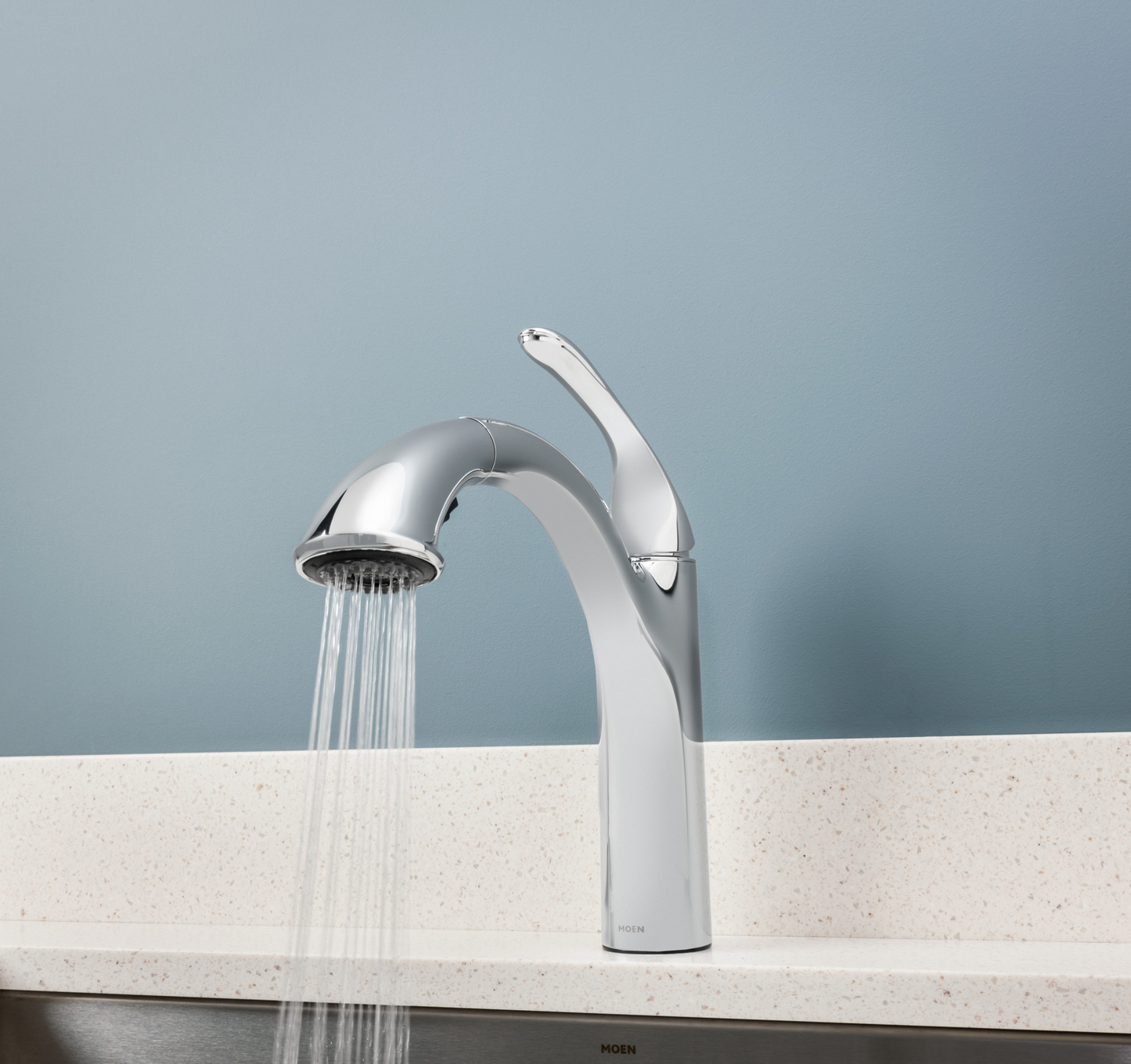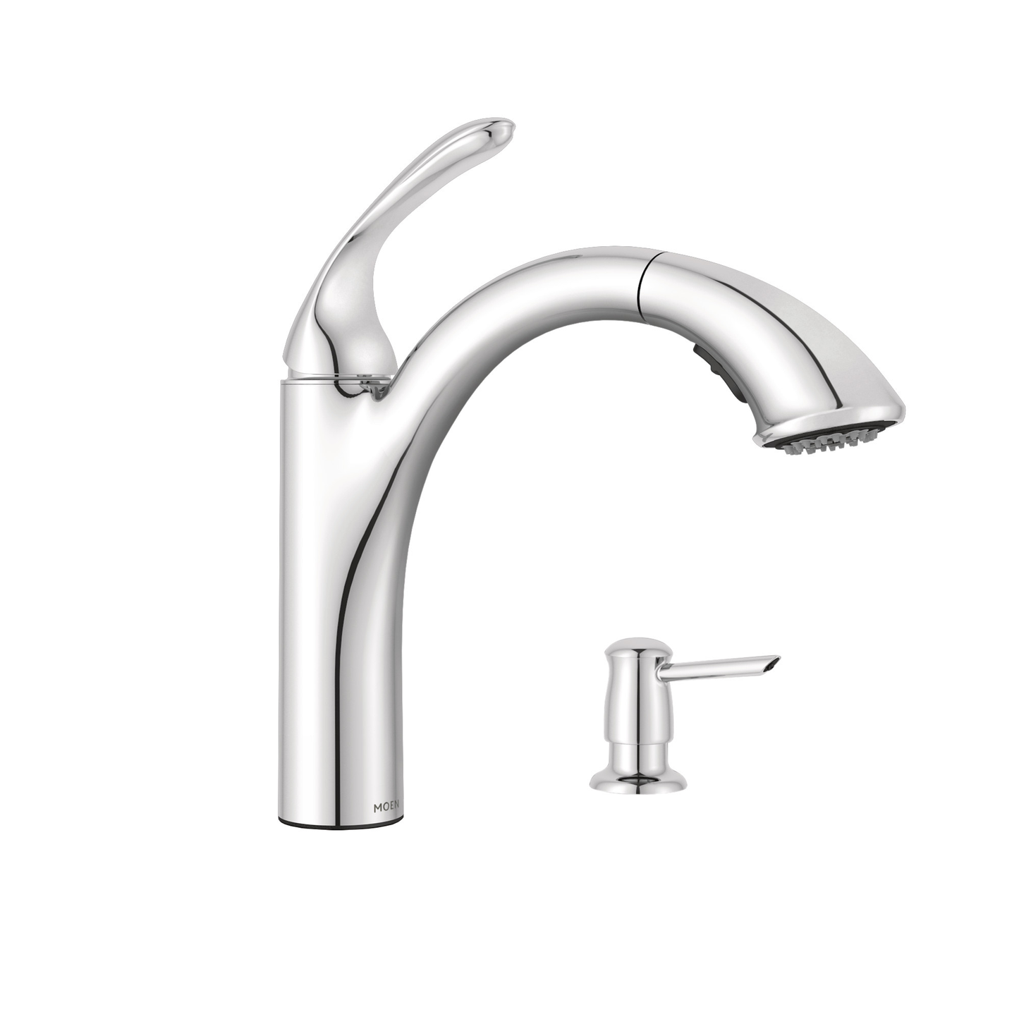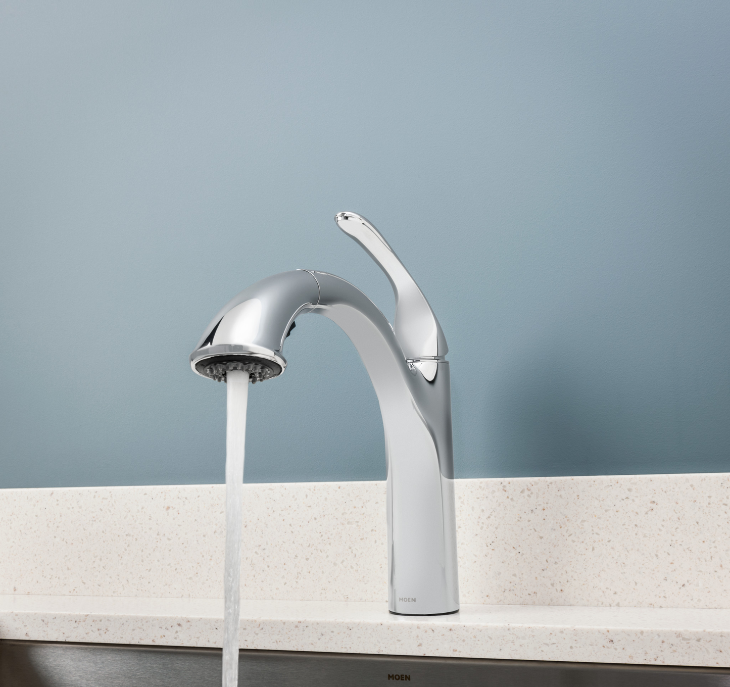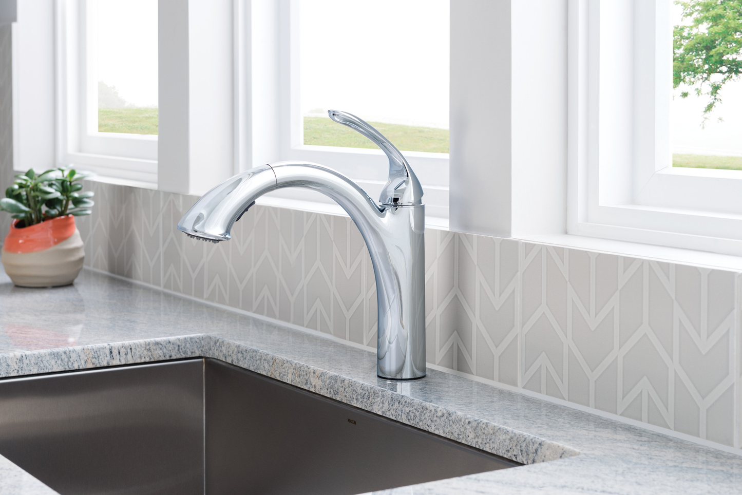 Simple, refined lines create a stylish faucet for your home. Ergonomically designed to work with you, the effortless functionality of the Kinzel pullout faucet features the Reflex flexible hose system. Inspired by real users - Moen faucets with Reflex self-retract and securely dock to provide smooth operation and easy movement, offering a more convenient kitchen experience every day.