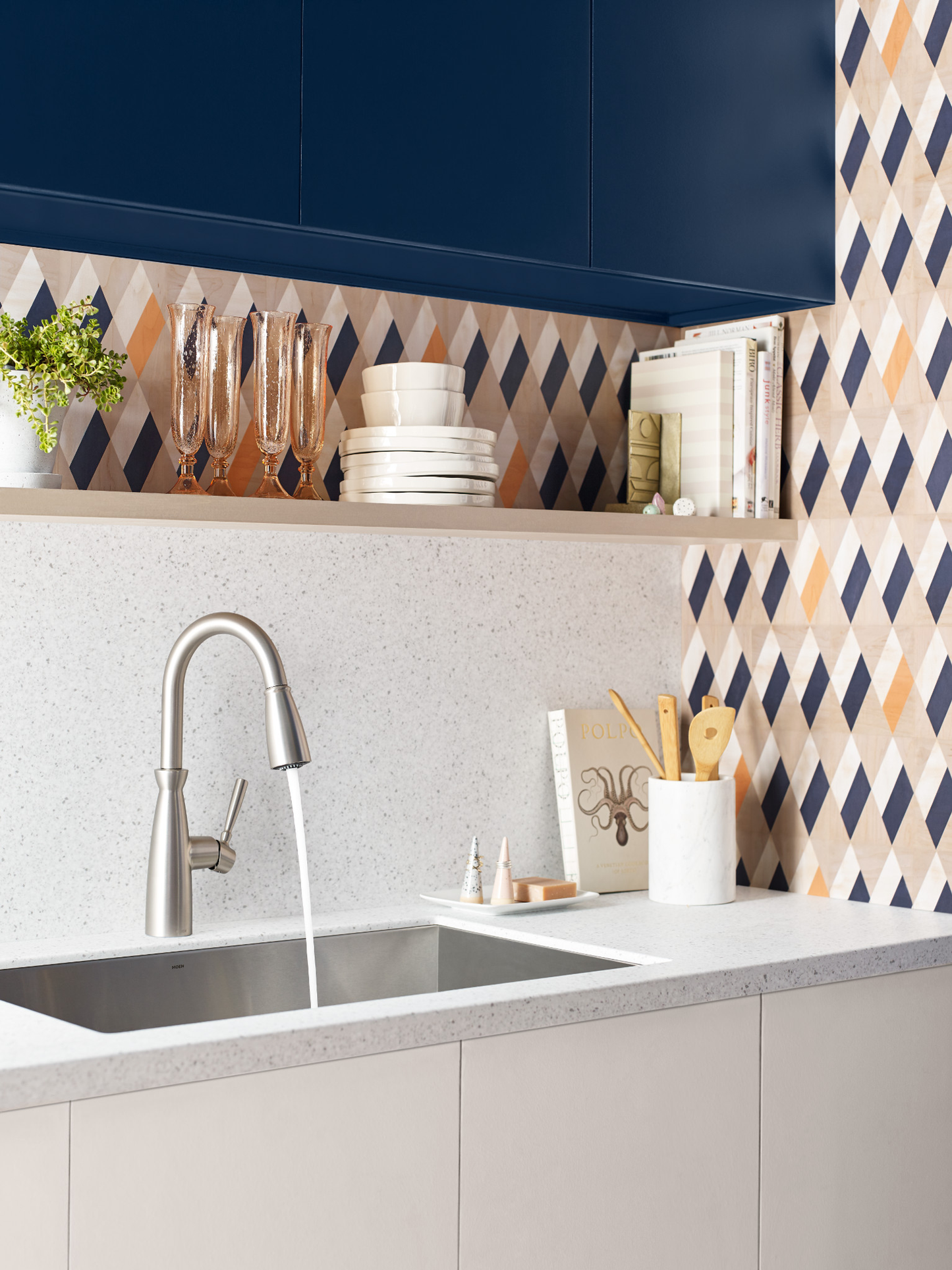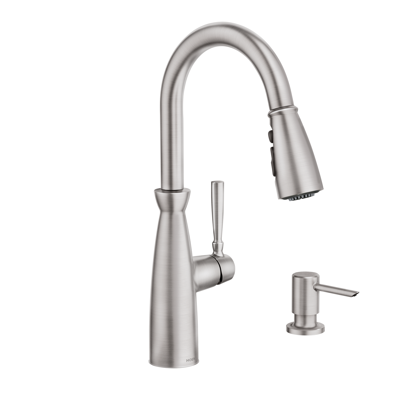 The Surie pulldown kitchen faucet artfully mixes Traditional design details with clean, contemporary lines for a current take on classic design. The faucet features Moen's Power Boost technology, which provides a faster clean and a faster fill with the push of a button, while the Reflex system ensures smooth operation and secure docking of the spray wand.