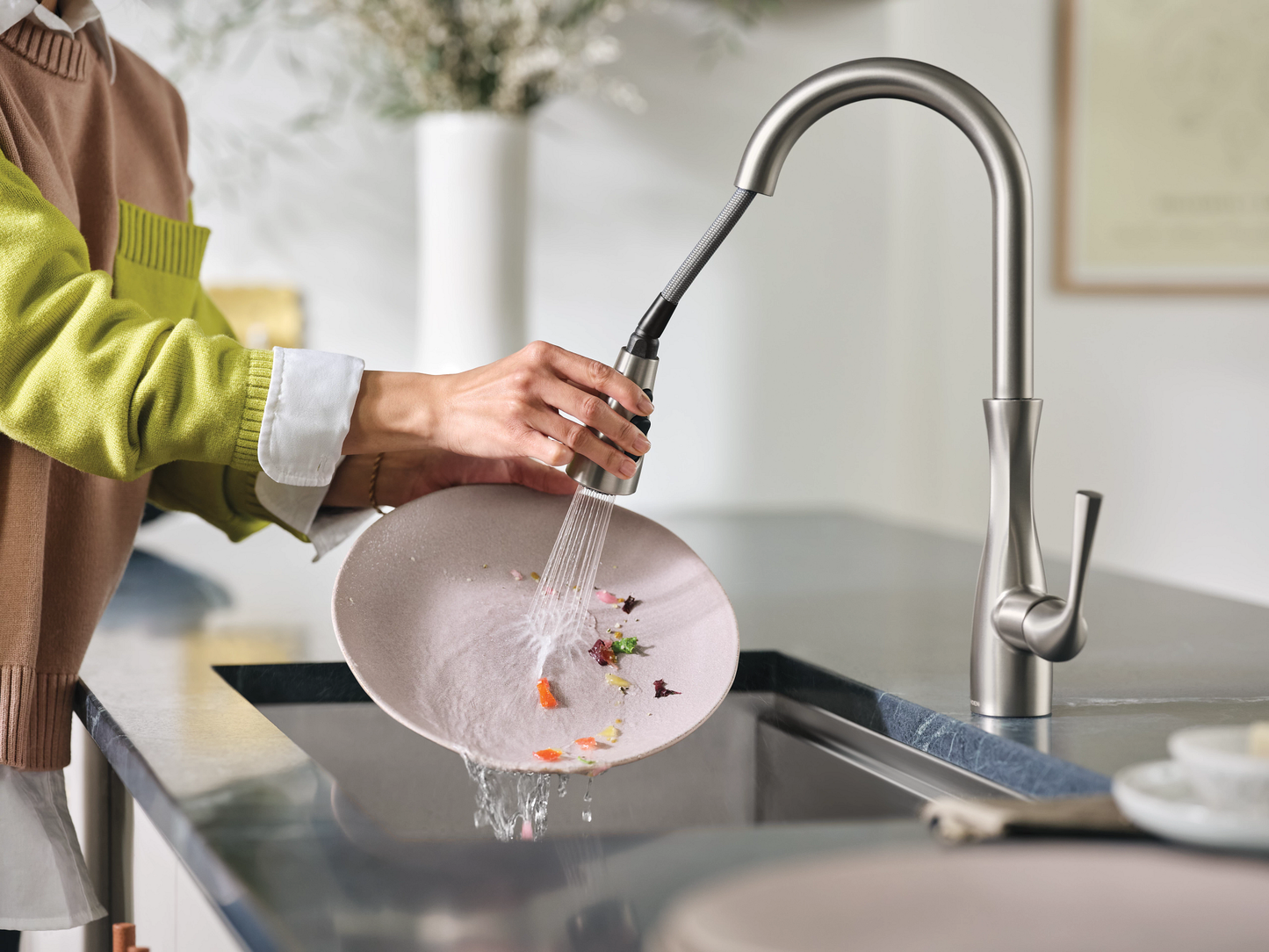 A sleek design with elegant curves, the Arlia™ Pulldown Kitchen Faucet combines style with functionality to stand out in any kitchen. With Power Boost™ technology, the faucet provides a faster clean and fill than Moen faucets without it – all with the push of a button. The seamless integration of the Reflex® system enables the faucet’s sprayer to retract automatically, putting itself away effortlessly. Available in Chrome for a mirror-like look that works with any aesthetic.