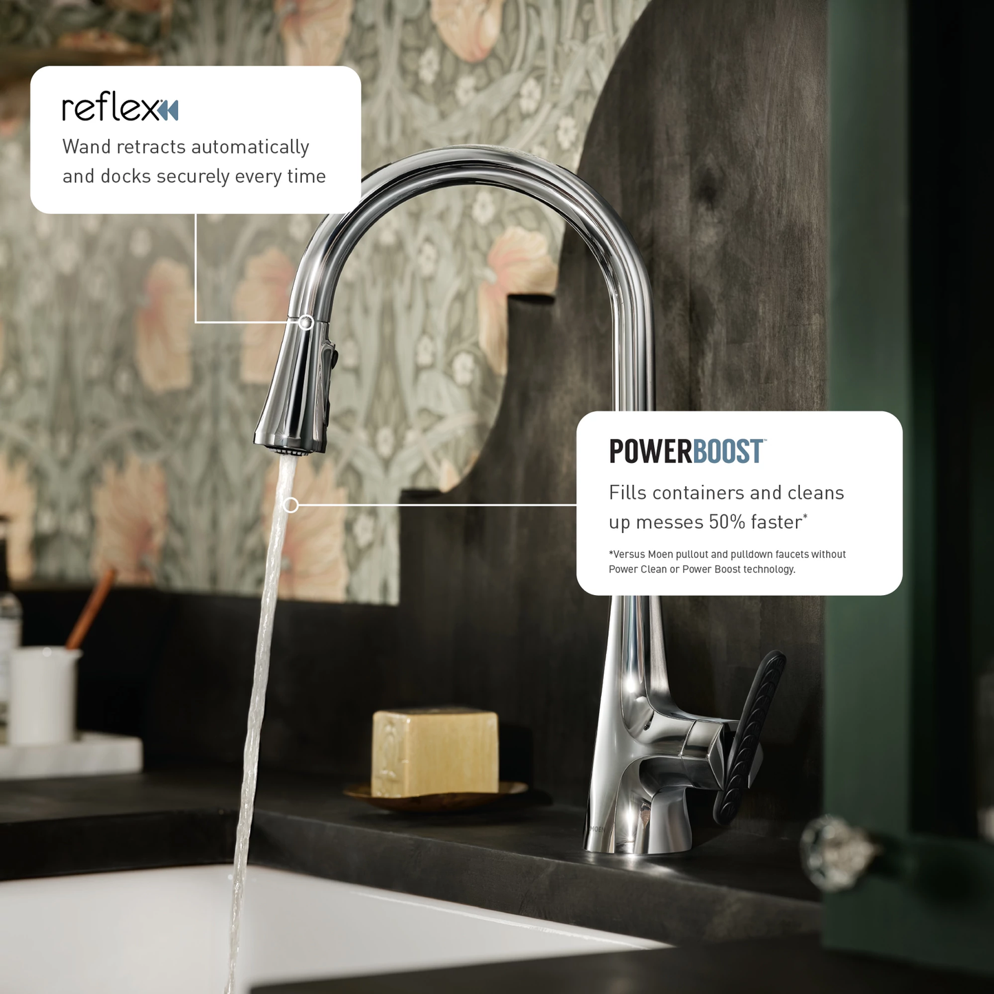 A sleek design with elegant curves, the Arlia™ Pulldown Kitchen Faucet combines style with functionality to stand out in any kitchen. With Power Boost™ technology, the faucet provides a faster clean and fill than Moen faucets without it – all with the push of a button. The seamless integration of the Reflex® system enables the faucet’s sprayer to retract automatically, putting itself away effortlessly. Available in Chrome for a mirror-like look that works with any aesthetic.