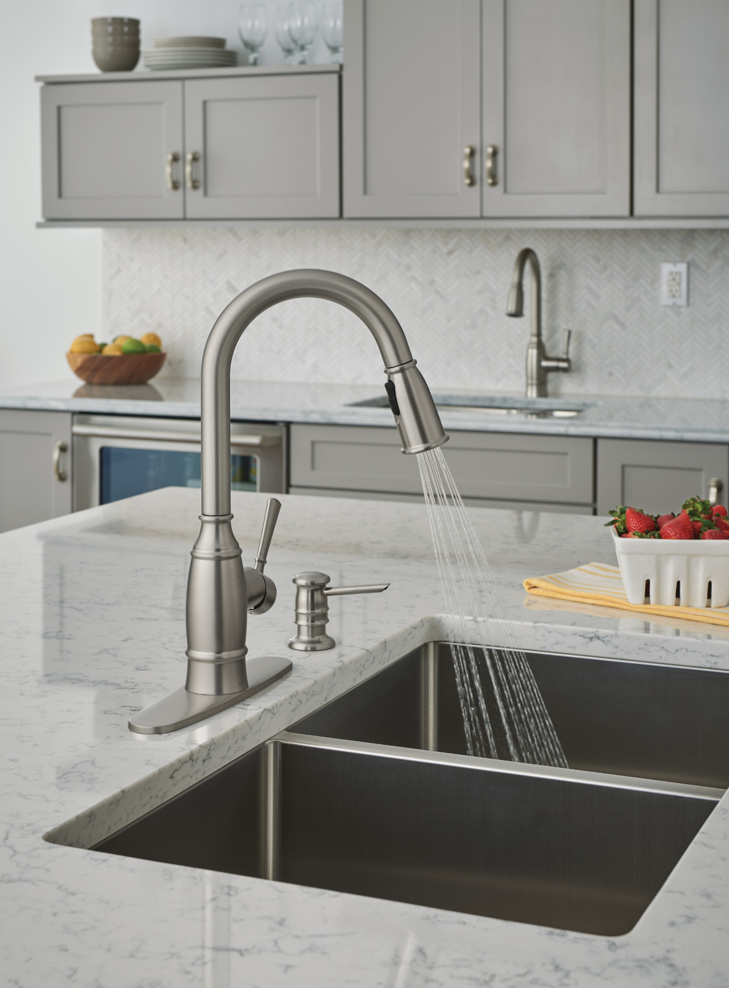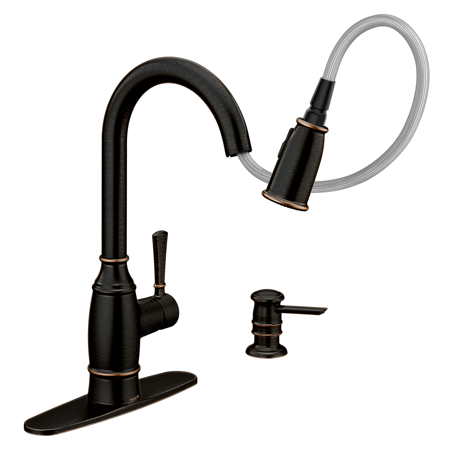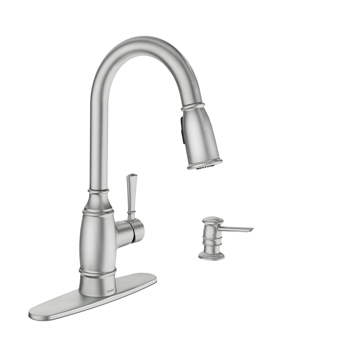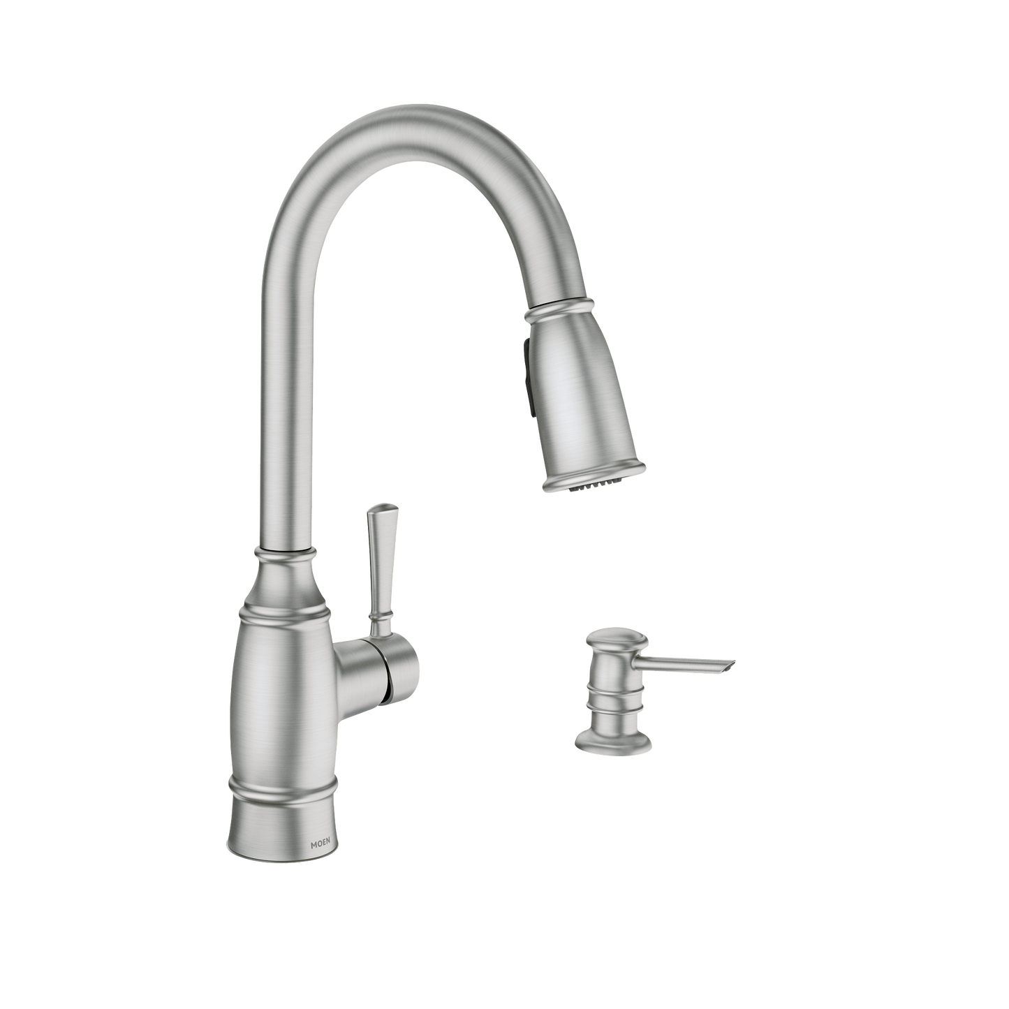 The Moen Noell 1-Handle Kitchen Faucet was designed with attention to detail. The Noell collection embodies elaborate Traditional designs to enhance the style and design of any home. This faucet includes a side spray hose for convenient, flexible cleaning at the sink.