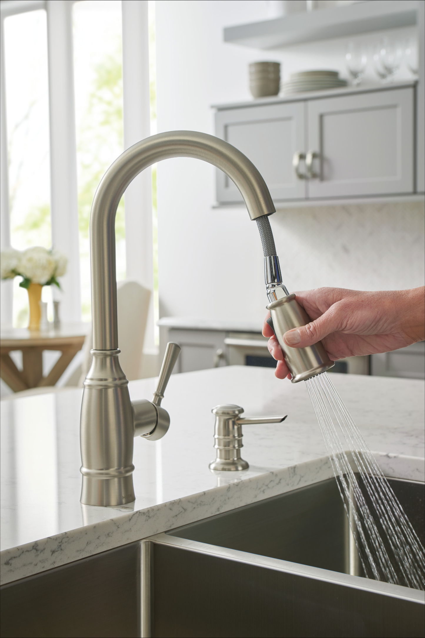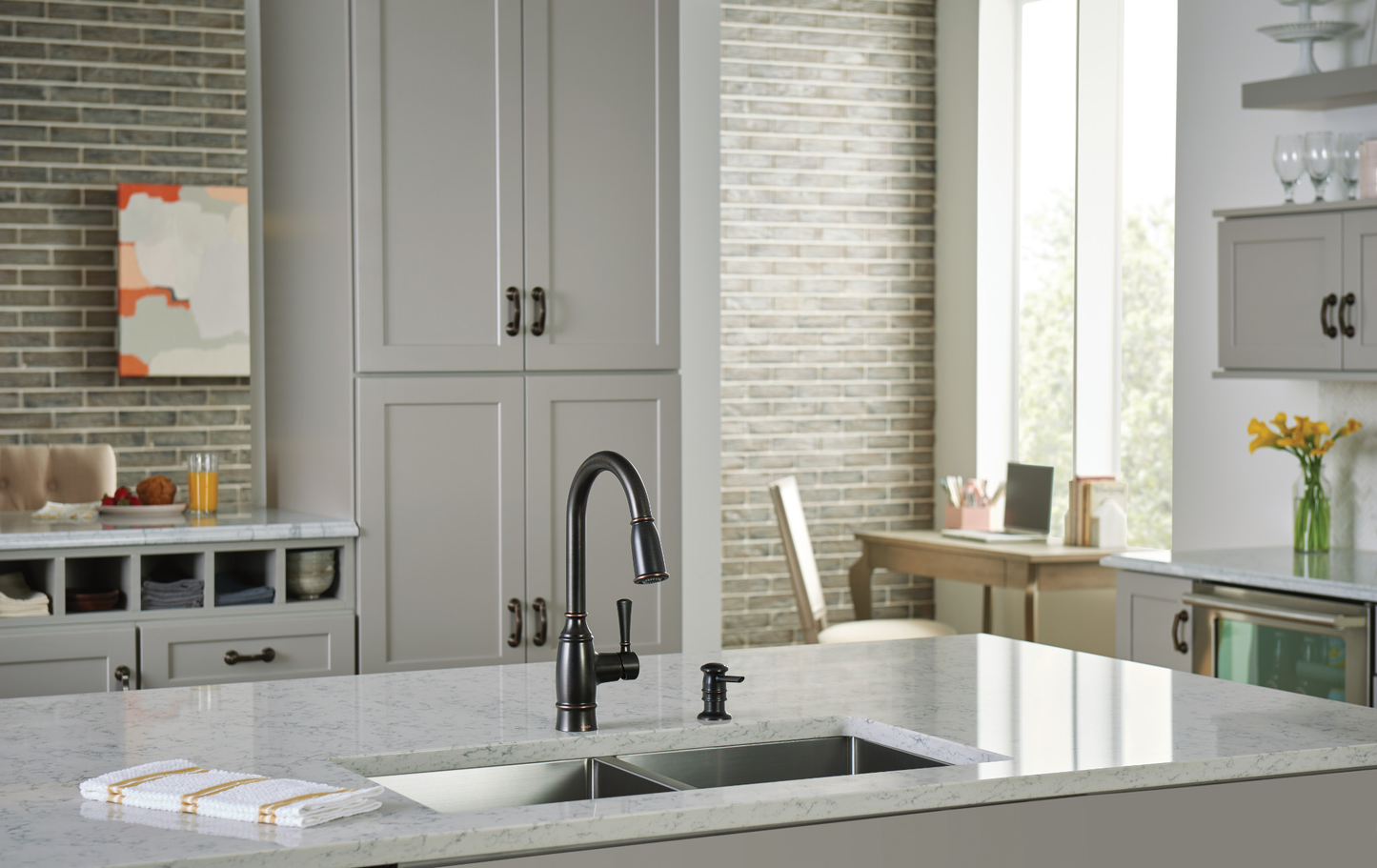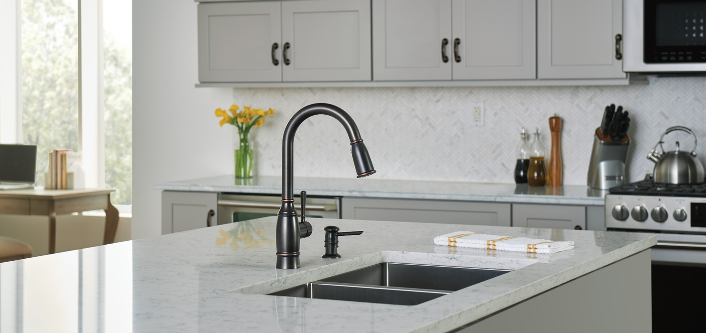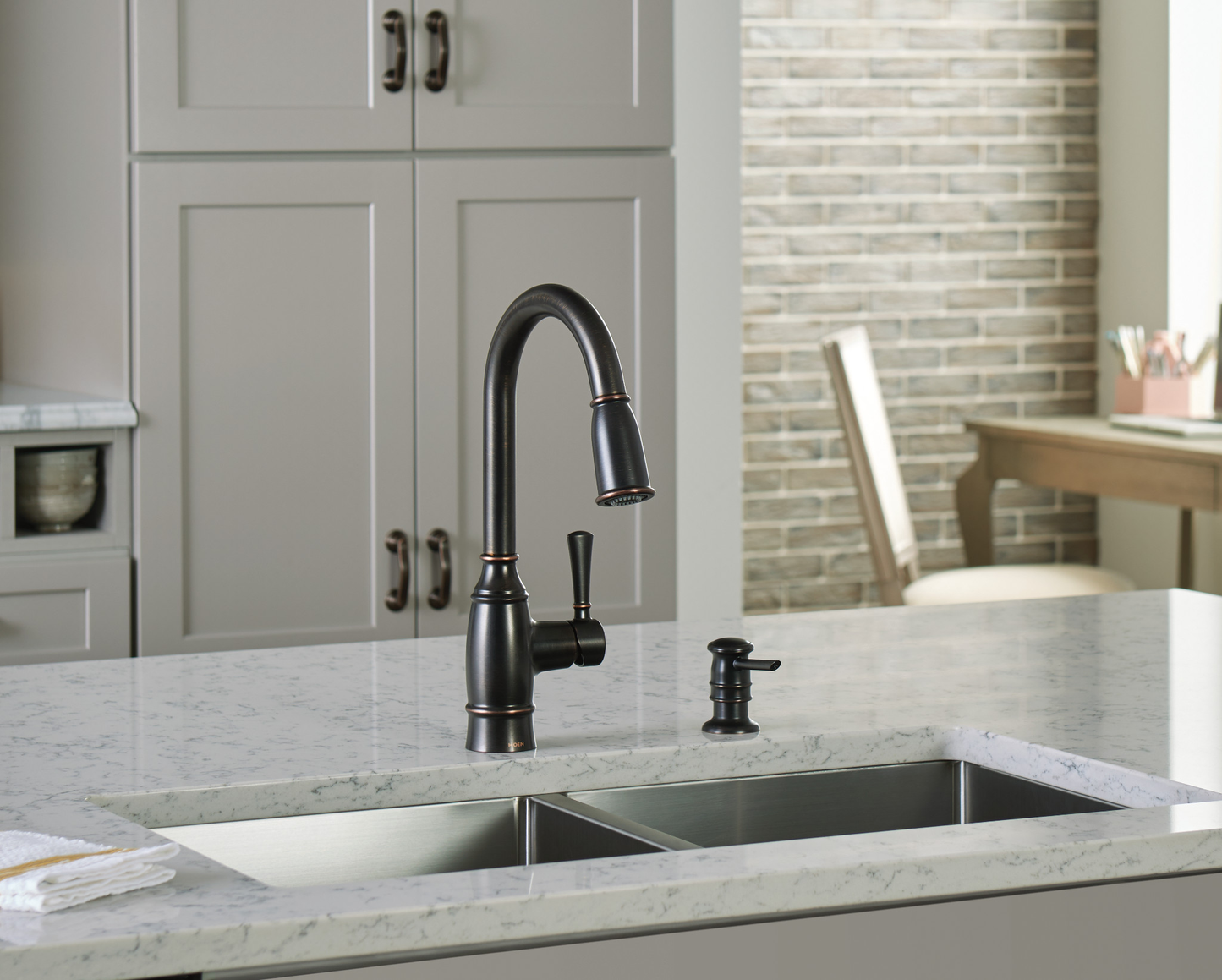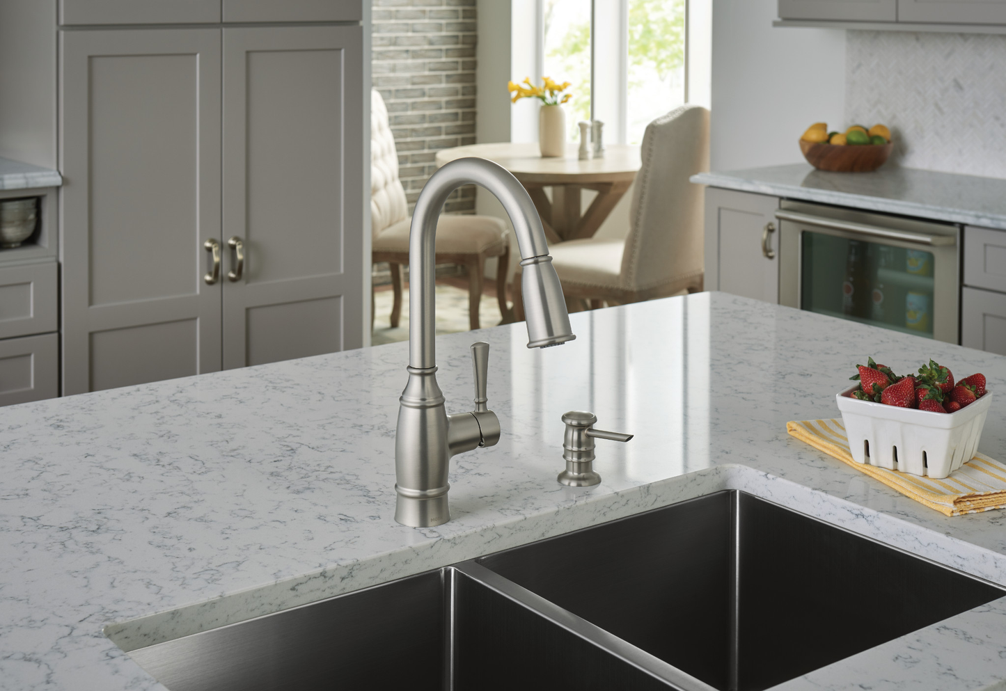 The Moen Noell 1-Handle Kitchen Faucet was designed with attention to detail. The Noell collection embodies elaborate Traditional designs to enhance the style and design of any home. This faucet includes a side spray hose for convenient, flexible cleaning at the sink.