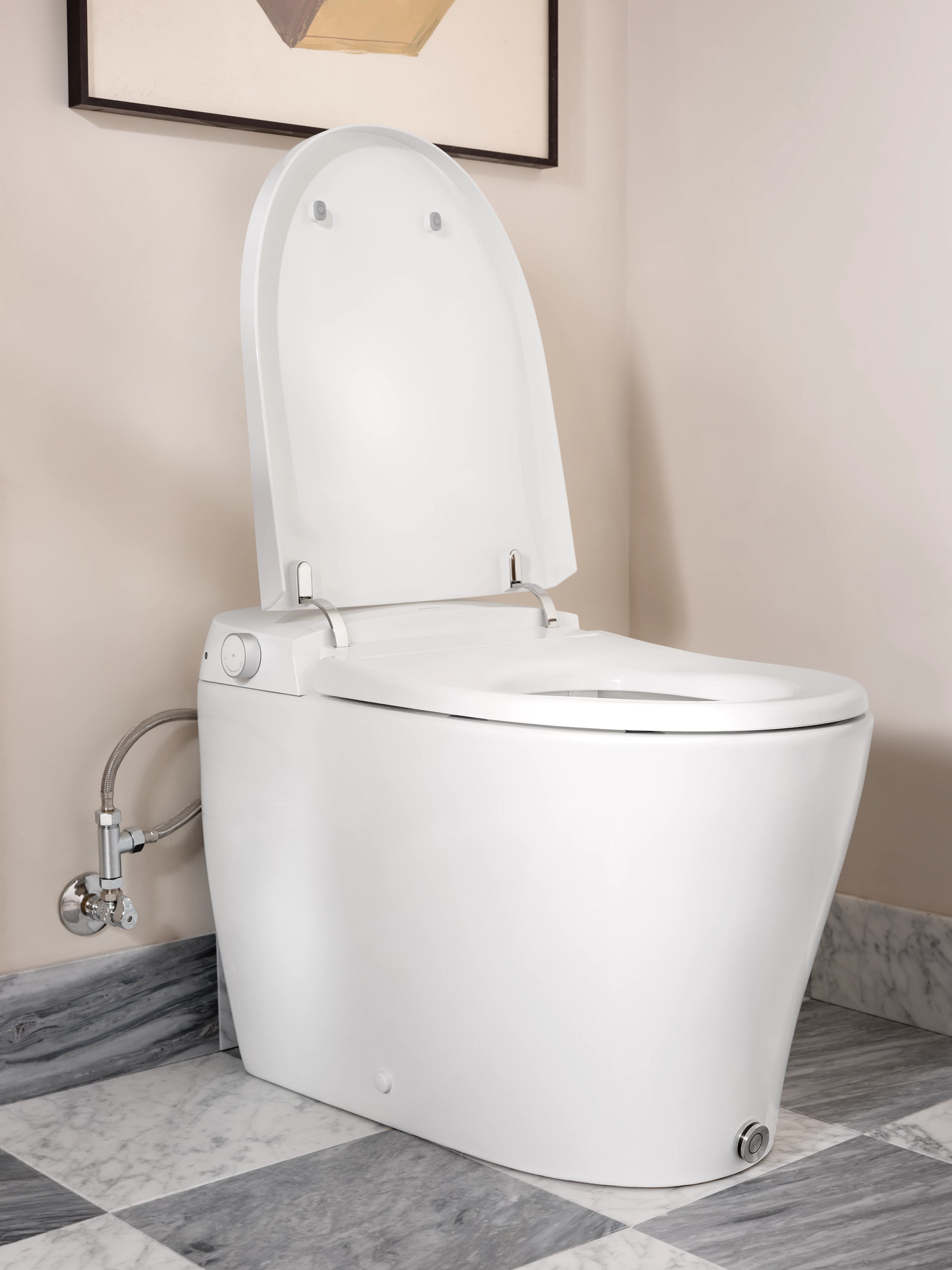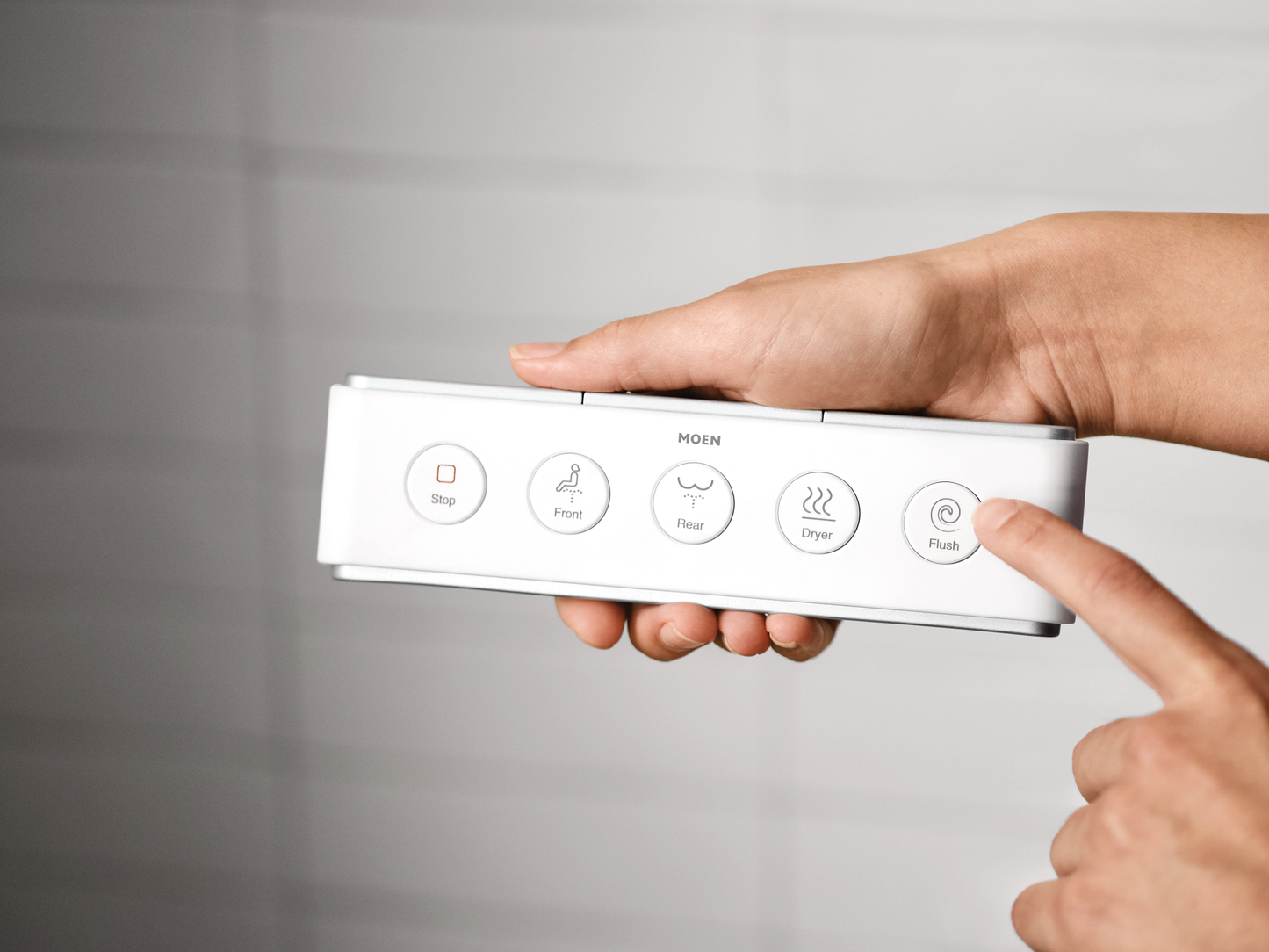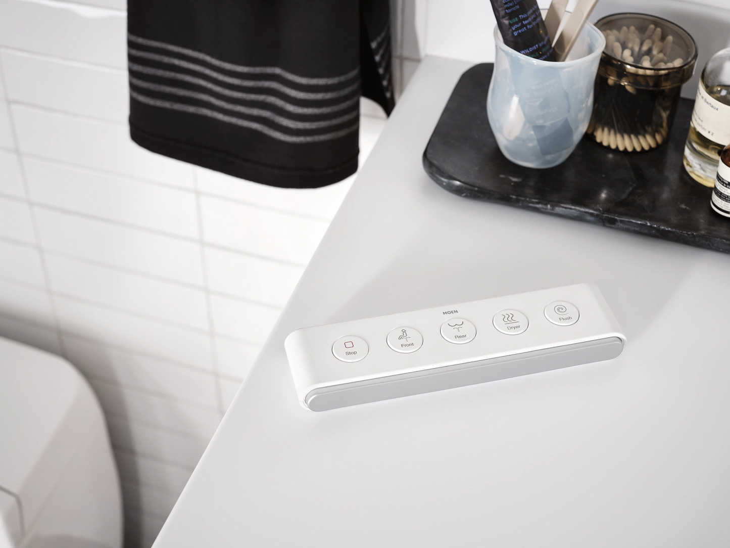 The 5-Series Electronic Cleansing Toilet (eToilet) from Moen gives you a comfortable and complete clean with its powerful performance all with the push of a button. This all-in-one toilet and bidet solution provides a sleek, low-profile design and includes features to provide a custom bathroom experience such as with endless, instantaneous heated water with front and rear cleansing, pressure and temperature control, and various spray options. The remote allows you to control all aspects of the toilet including a stop button, front wash control, rear wash control, dryer control, flush control, and open/close lid/seat to elevate the bathroom experience. The 5-Series eToilet pre-wets the bowl prior to use to ensure the toilet stays cleaner longer without any chemicals and features self-cleaning nozzle, UV technology, and deodorizer for added cleanliness. It also has enhanced foot control functionality for a truly hands-free design. Additionally, eToilets provide the opportunity to cut down on toilet paper use, while enhancing comfort and personal hygiene.