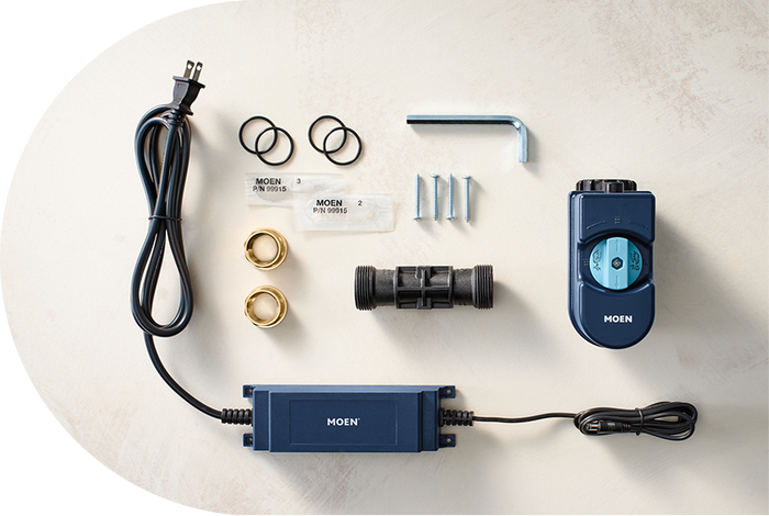 The Flo Smart Water Monitor and Shutoff with everything you need for installation, including a 25-foot extension cord and tail pieces to fit your water line.