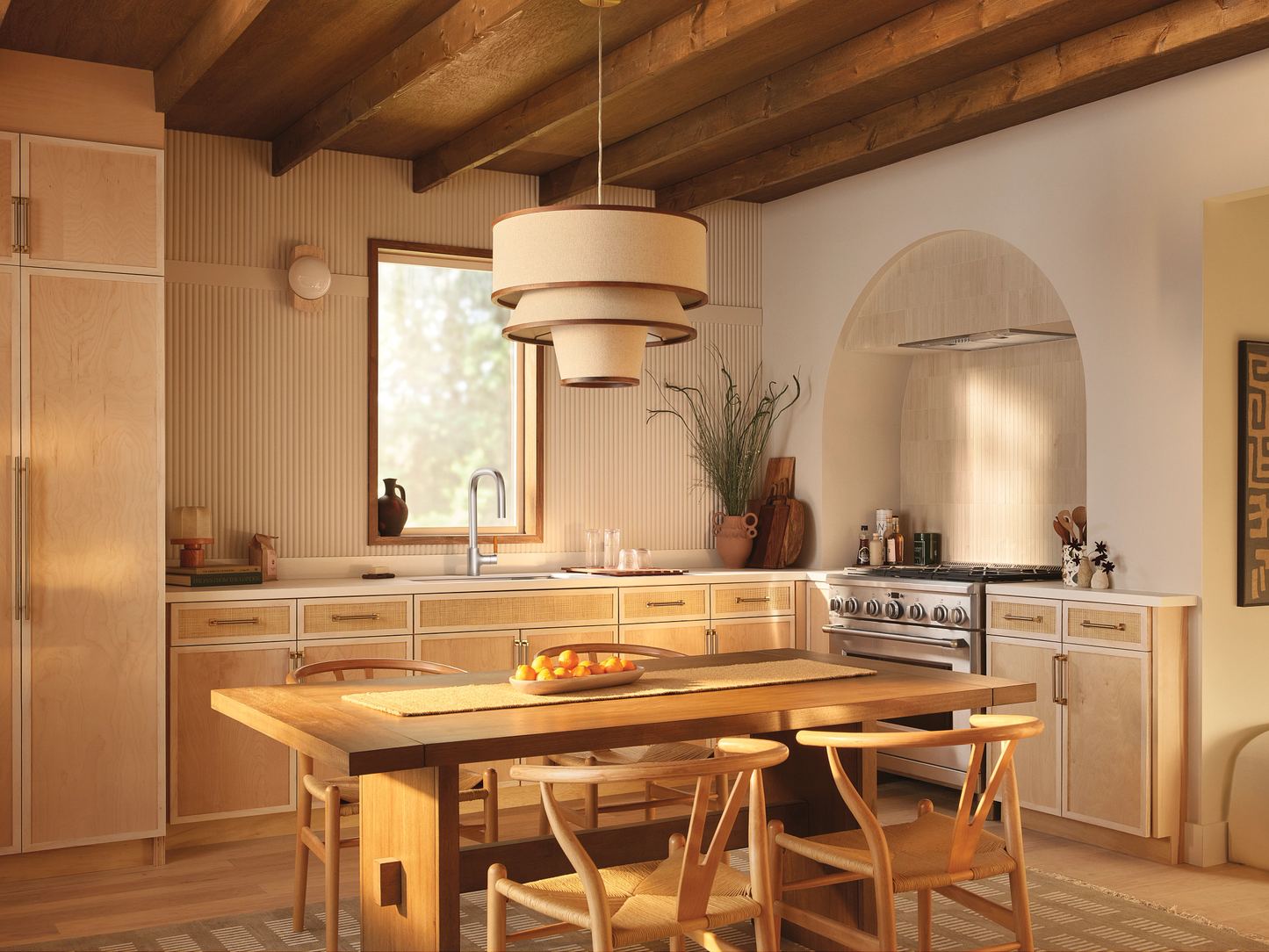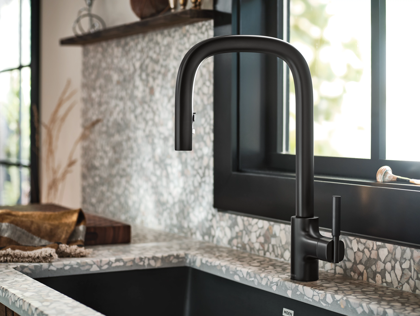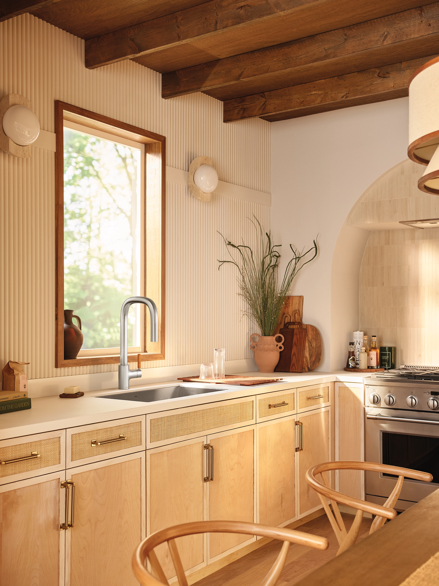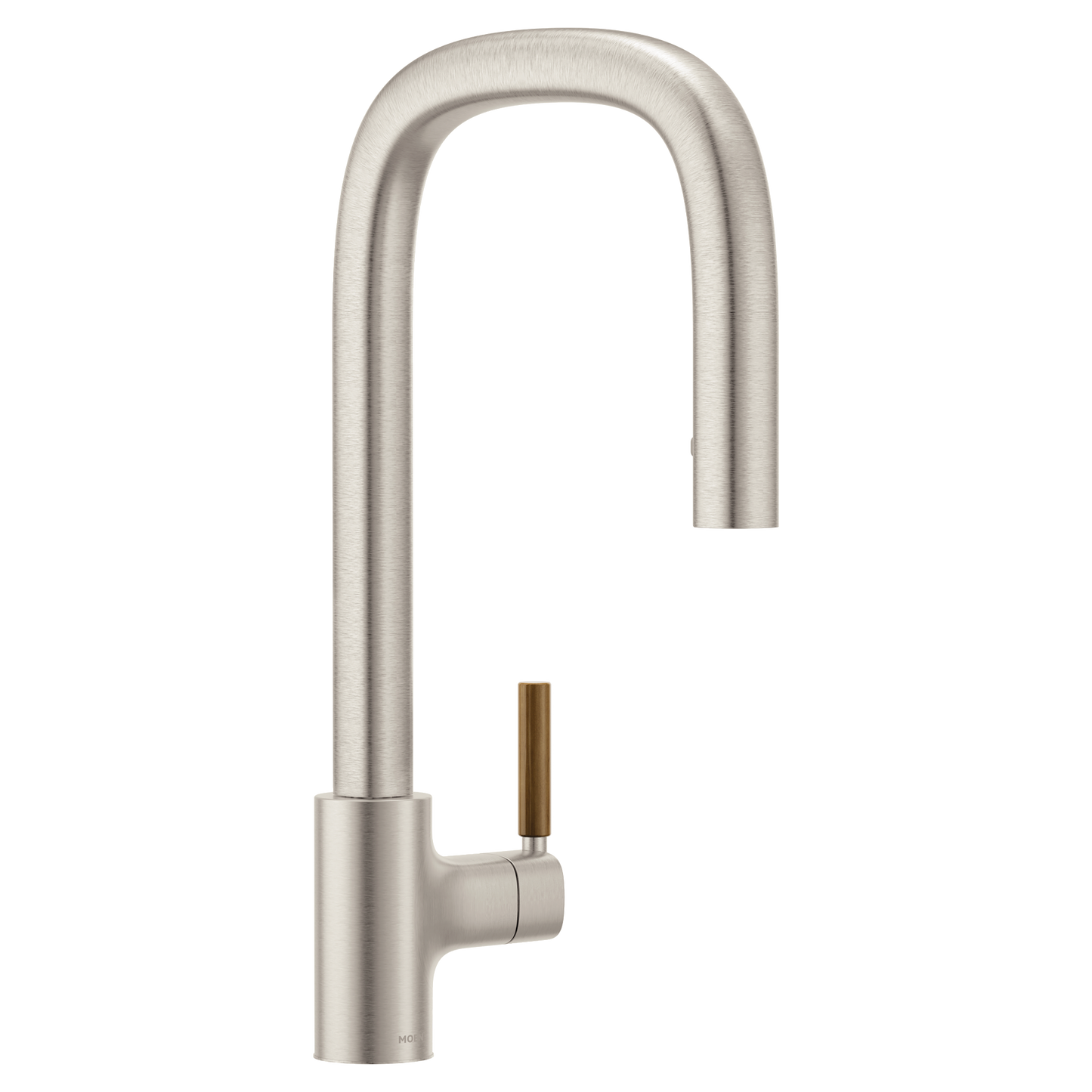 The Tenon™ pulldown kitchen faucet brings a touch of warmth to the modern kitchen. The soft sweeping double bent arcs of the spout blend organic and symmetrical shapes to create a calming and comfortable form, while the tall faucet stature creates a statement piece at the sink. The integrated pulldown spray wand nests neatly in the spout for a concealed, smooth look while still offering the functionality to enhance experiences at the sink. Available in Chrome, a clean, reflective finish that seamlessly melds with any design aesthetic. Comes with both an easy-to-swap, luxurious teak wood handle and a sleek metal handle in matching chrome finish—designed to seamlessly complement your kitchen décor.