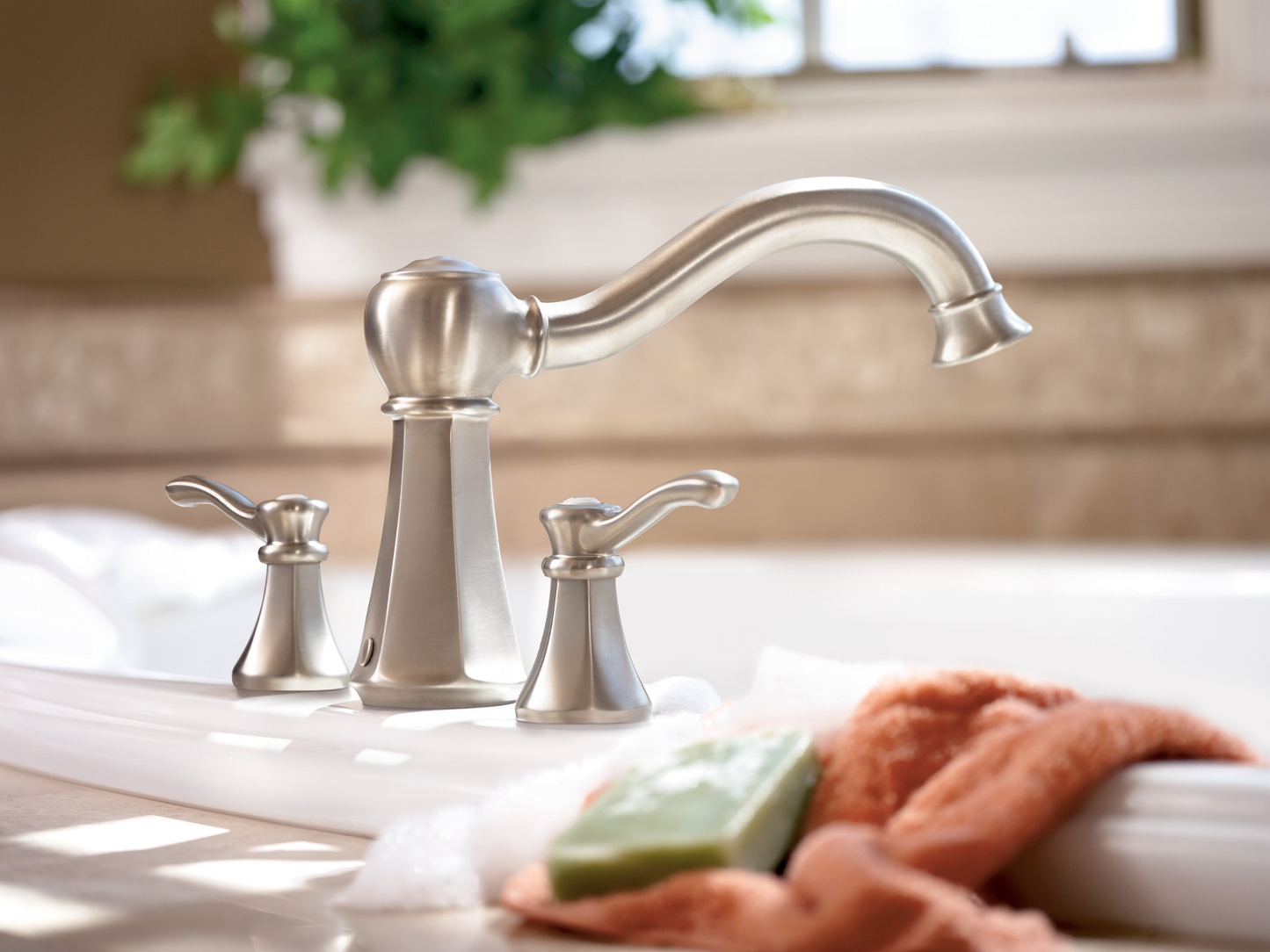 A faceted base and elegant spout are perfect examples of the stunning details that make Vestige faucets and accessories so special. This turn-of-the-century design is an ideal match for a highly Traditional bath featuring antique cabinetry.
