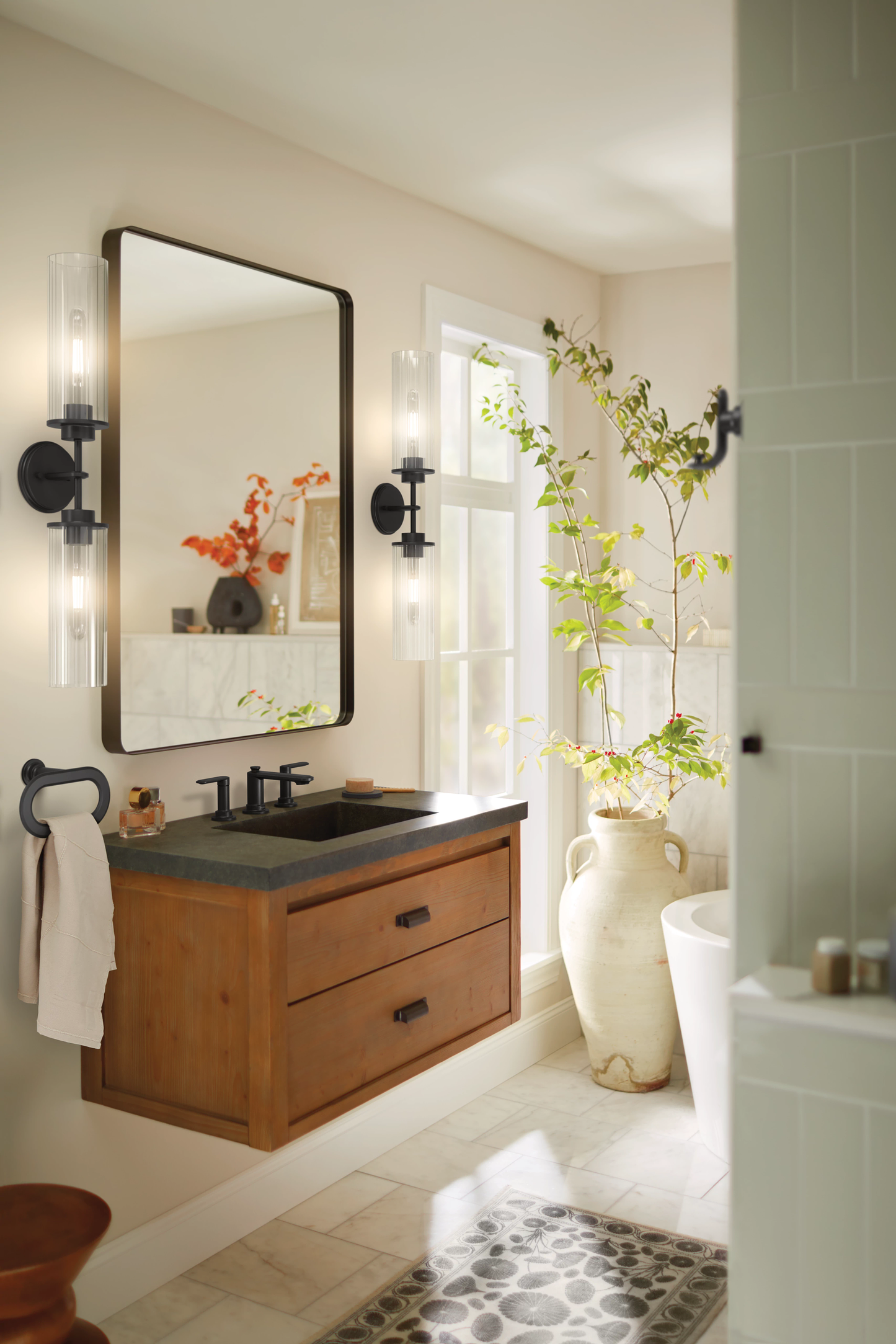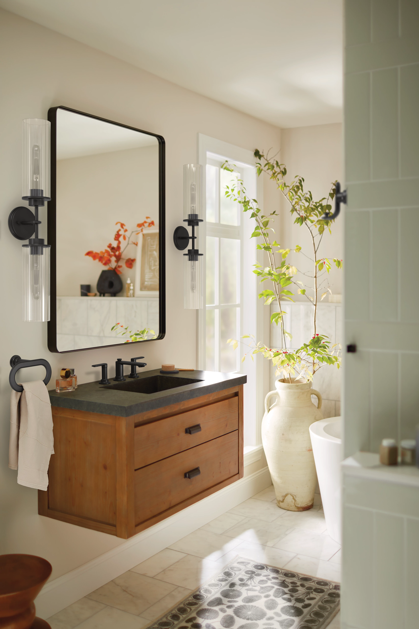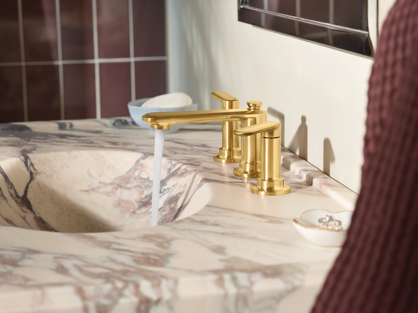 The Greenfield two handle widespread bathroom faucet provides an inviting transitional aesthetic in the bath. Featuring a mix of cast industrial forms and strong mid century horizontal lines and proportions, the faucet reflects the characteristics of the location that inspired its name Greenfield Village, home to numerous notable inventors. With unique beveled edges along the perimeter of the spout and the two thin handle levers, matched with double stacked bands at the base of the faucet and handles, the fixture offers visual cleanness and sophisticated style. Available in Chrome, a bold, reflective finish that seamlessly melds with any design aesthetic.