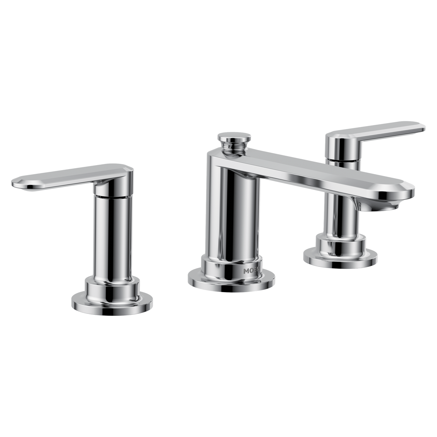 The Greenfield two handle widespread bathroom faucet provides an inviting transitional aesthetic in the bath. Featuring a mix of cast industrial forms and strong mid century horizontal lines and proportions, the faucet reflects the characteristics of the location that inspired its name Greenfield Village, home to numerous notable inventors. With unique beveled edges along the perimeter of the spout and the two thin handle levers, matched with double stacked bands at the base of the faucet and handles, the fixture offers visual cleanness and sophisticated style. Available in Chrome, a bold, reflective finish that seamlessly melds with any design aesthetic.