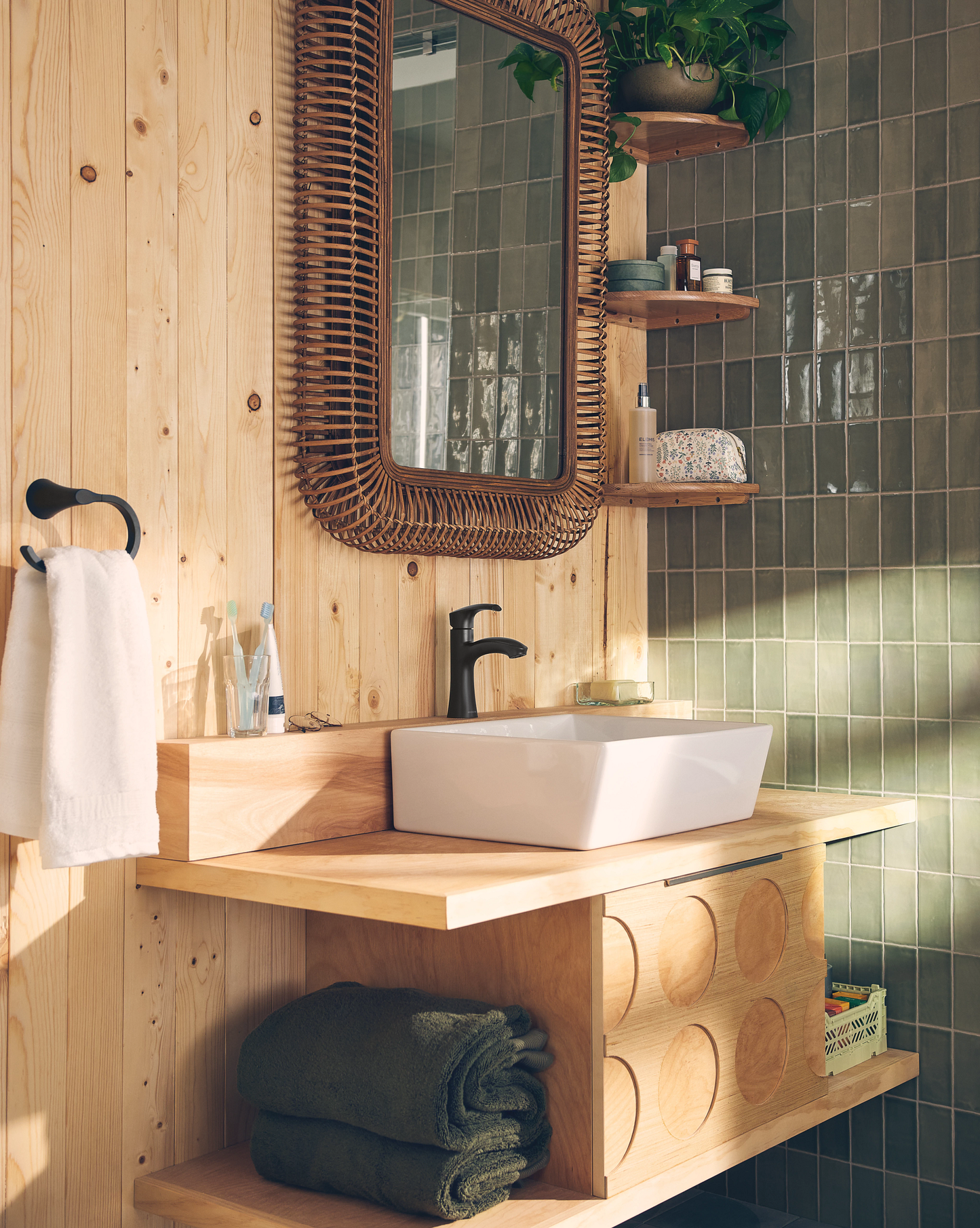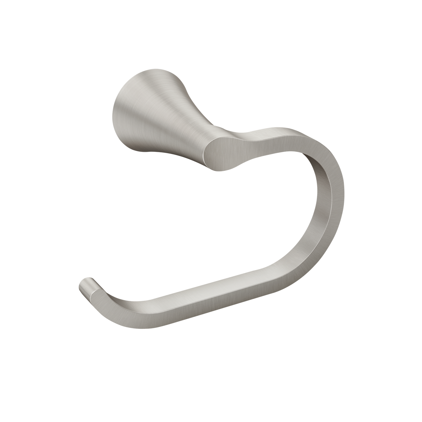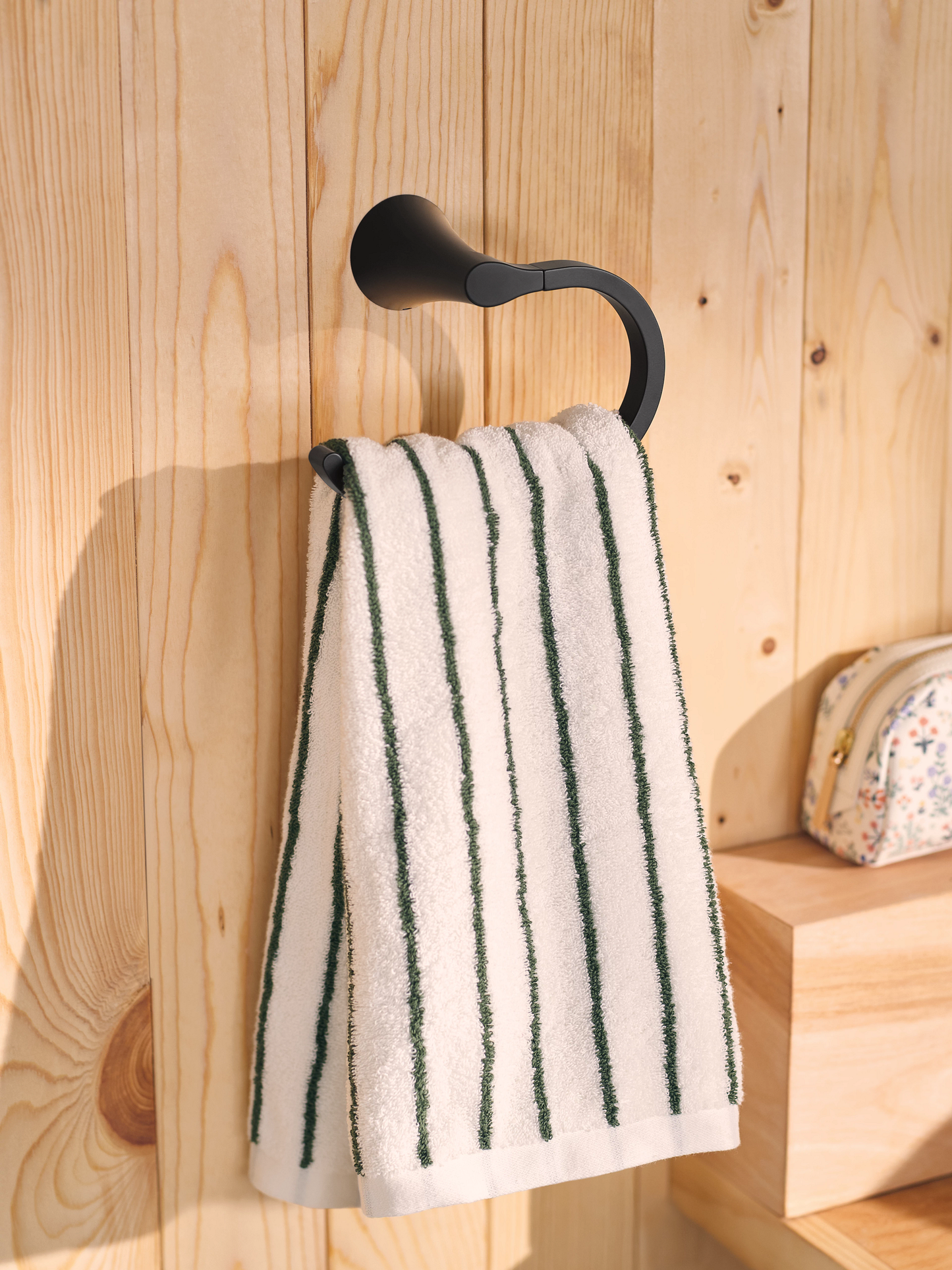 Featuring perfectly matching faucets, showerheads and accessories, the Graeden™ bathroom collection from Moen offers a sleek, transitional look that seamlessly blends into a number of different design aesthetics. The Graeden Towel Ring’s flowing curves elegantly drape hand towels, adding a touch of grace to your bathroom's décor. Available in a shiny, mirror-like Chrome finish for a fresh look and feel.