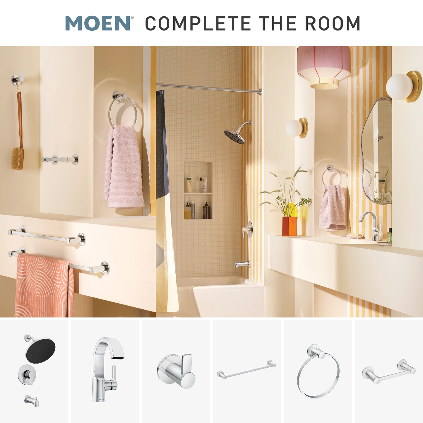 Featuring cylindrical shapes and smooth edges, Moen’s Avri™ suite of perfectly matching faucets, showerheads and accessories brings a soft, luxe, modern design to any bathroom. The Avri Robe Hook provides a convenient, stylish spot for storing robes and towels, while blending seamlessly with the rest of the Avri collection for a cohesive design throughout the space. Available in a shiny, mirror-like Chrome finish for a fresh look and feel.