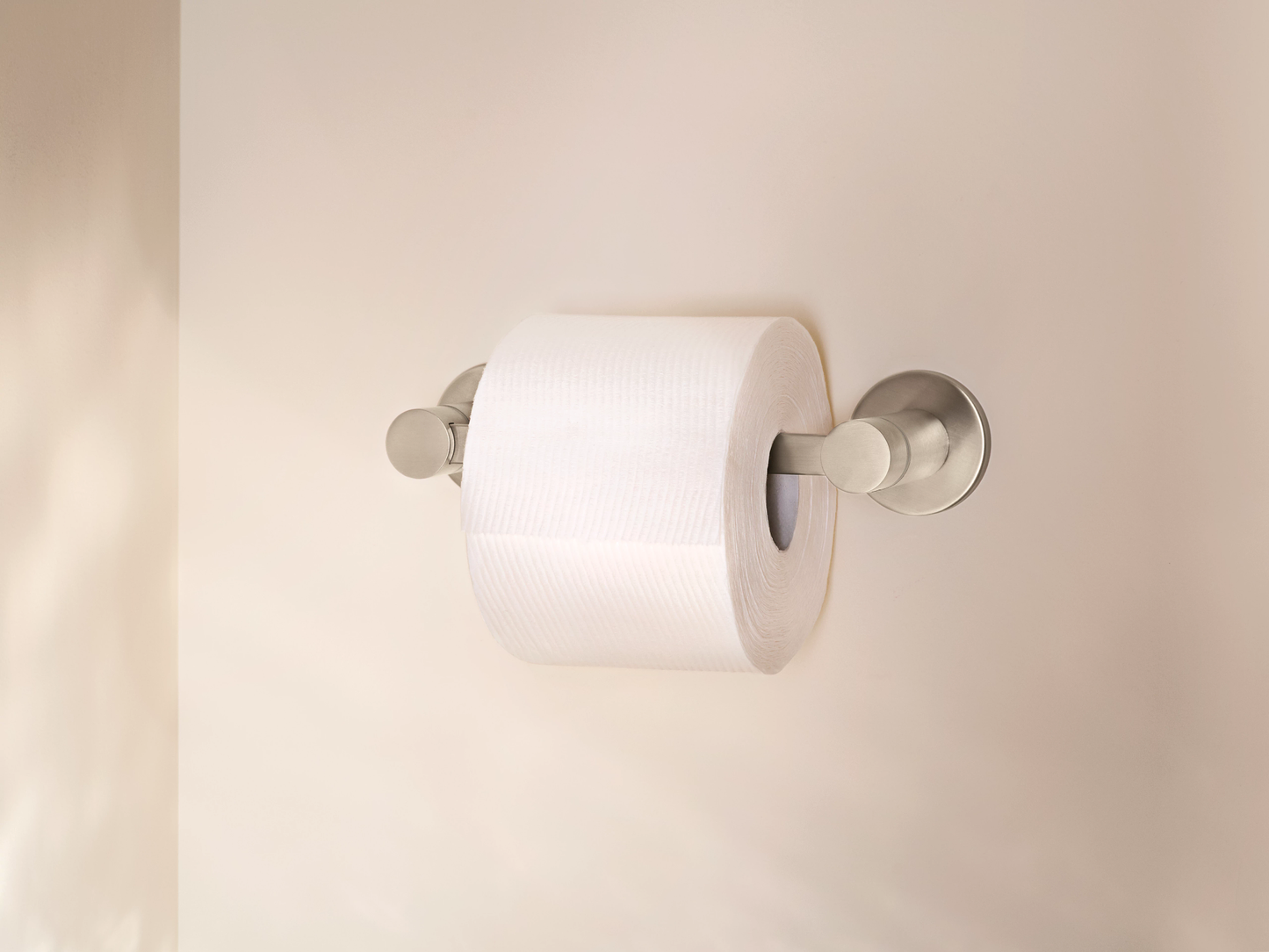 Moen’s Avri™ suite of perfectly matching faucets, showerheads and accessories brings a soft, luxe, modern design to any bathroom. The Avri Pivoting Toilet Paper Holder features an innovative, spring-free design that makes replacing the roll of paper quick and easy. Simply lift the arm, insert the new roll and set the arm back into place. Available in a shiny, mirror-like Chrome finish for a fresh look and feel.