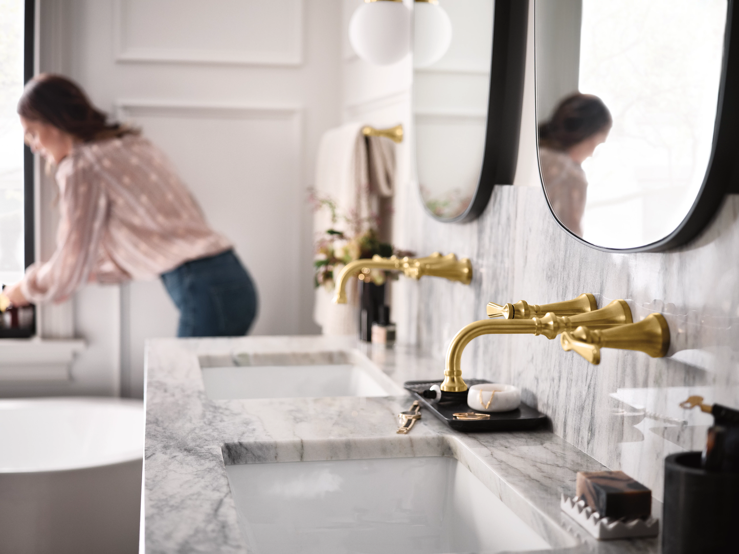 Colinet, is a highly distinctive suite that perfectly complements any bath by providing a wide décor style reach depending on its finish. In chrome and brushed nickel, Colinet is tailored Traditional. In brushed gold, it’s the epitome of glamour. In matte black, it defines industrial chic. Its name is inspired by colonnette, which is a small, slender column in architectural design.