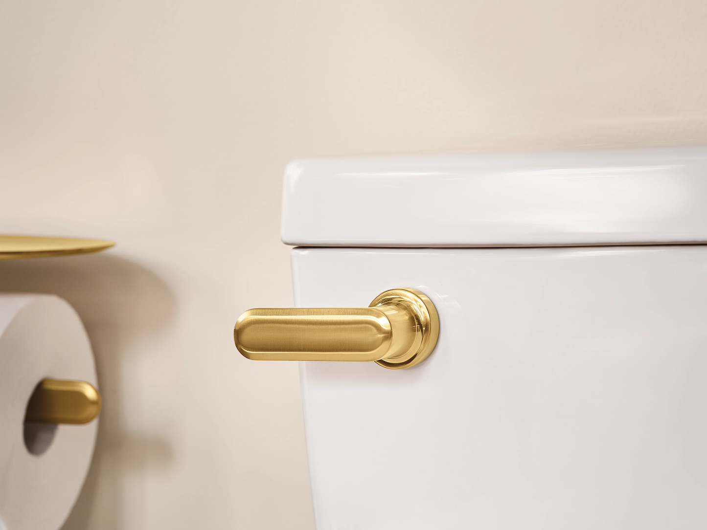 The Greenfield bathroom collection offers an inviting transitional aesthetic featuring a mix of cast industrial forms and strong mid century horizontal lines and proportions. With unique design elements, such as beveled edges and double stacked bands, the suite provides visual cleanness an d sophisticated style. Part of the complete collection of perfectly matching Greenfield accessories, the tank lever adds a fashionable detail to the room’s décor. Available in Chrome, a clean, shiny, mirror like finish, that gives a more modern look and feel.