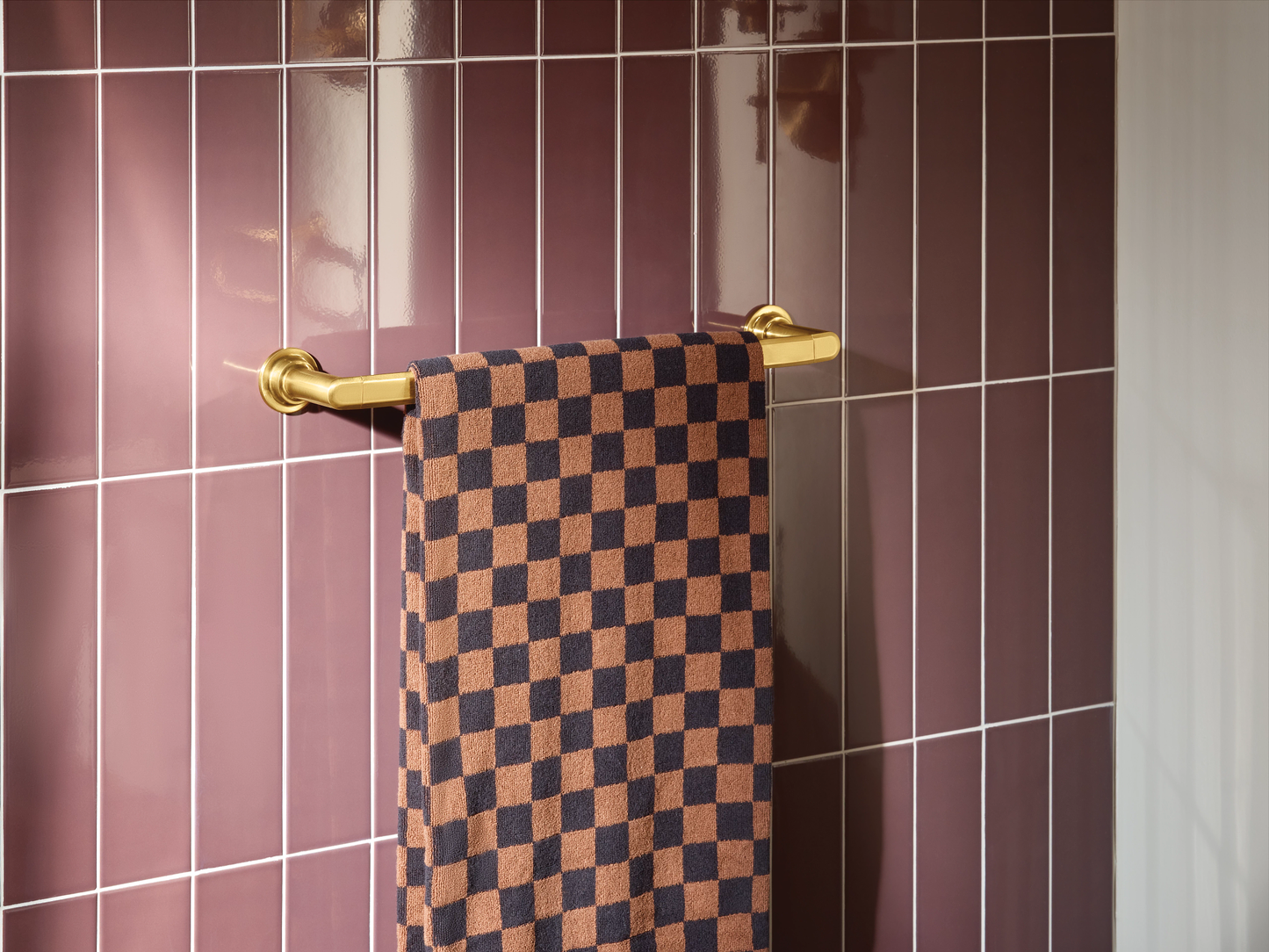 The Greenfield bathroom collection offers an inviting transitional aesthetic featuring a mix of cast industrial forms and strong mid century horizontal lines and proportions. With unique design elements, such as beveled edges and double stacked bands, the suite provides visual cleanness an d sophisticated style. Part of the complete collection of perfectly matching Greenfield accessories, the 18 inch towel bar offers style and convenience, providing the perfect spot to beautifully display bath linens. Available in Chrome, a clean, shiny, mirror like finish, that gives a more modern look and feel.