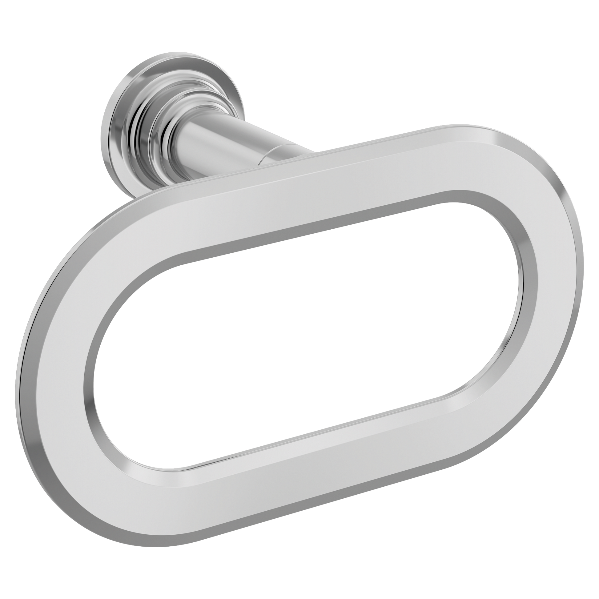 The Greenfield bathroom collection offers an inviting transitional aesthetic featuring a mix of cast industrial forms and strong mid century horizontal lines and proportions. With unique design elements, such as beveled edges and double stacked bands, the suite provides visual cleanness and sophisticated style. Part of the complete collection of perfectly matching Greenfield accessories, the towel ring offers style and convenience, providing the perfect spot to beautifully display towels. Available in Chrome, a clean, shiny, mirror like finish, that gives a more modern look and feel.